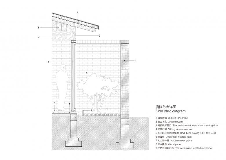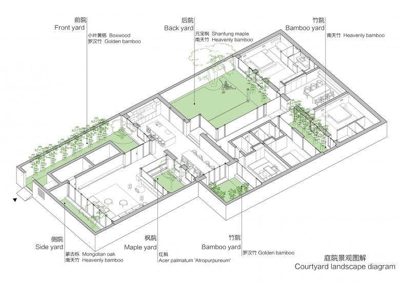 The original spatial pattern featuring one front yard and one back yard are reorganized, to form six yards with different scales, landscapes and functions. The front yard is set at the southwest core of the site. Opening the metal gate, a bamboo path leads the occupants to the building entrance. Pushing the door and entering the foyer, a courtyard with a maple tree comes into view. The maple tree displays the colors of nature in different seasons, and becomes a highlighted view between the living room and the dining room. Space set aside between the living room and the south enclosure wall forms a side yard, where trees and stones are set. In sunny days, the folding doors of the living room can be completely opened, to extend the yard into the interior.