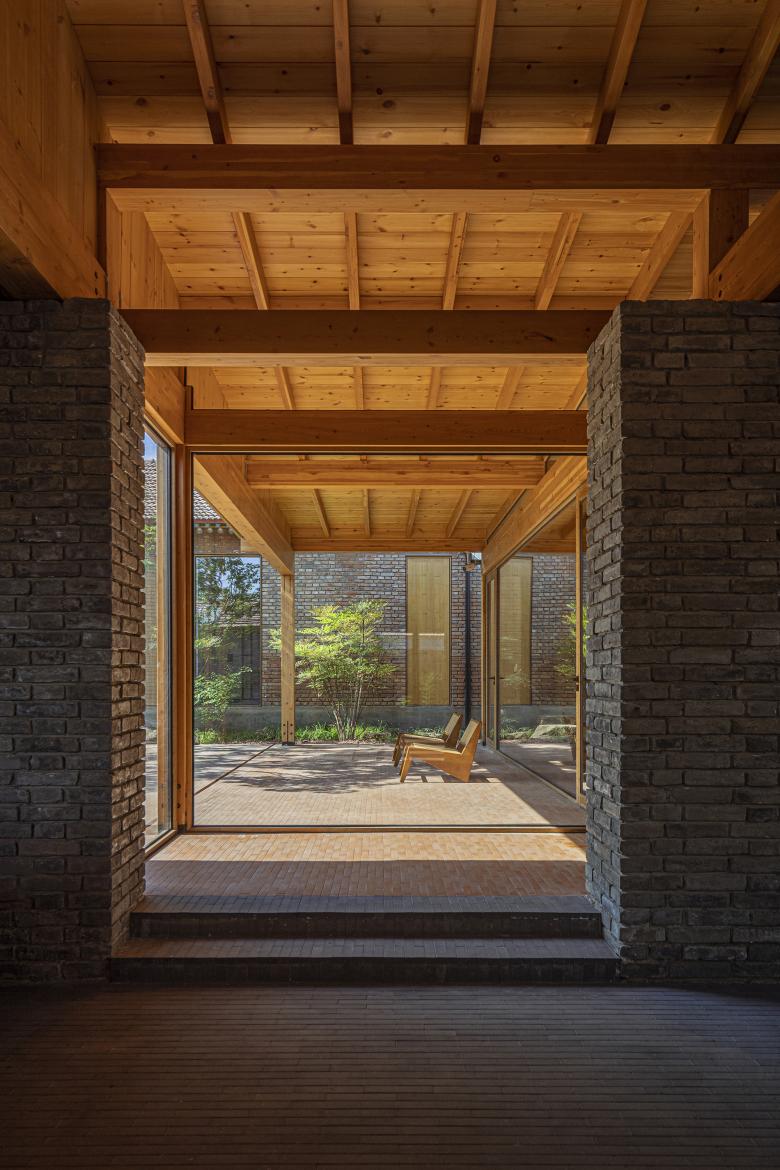 The space at the back is the bedroom area. The north building and the wooden construction are connected by a glass corridor, which naturally forms a narrow yard. The three bedrooms provide a direct view to the outdoor landscape, satisfy daylighting and ventilation needs, and meanwhile avoid obstructed sight lines. The organization of various yards brings natural vitality into every corner of the interior space.
