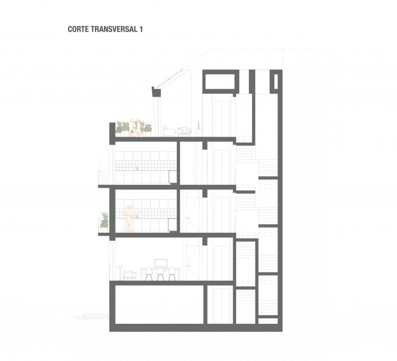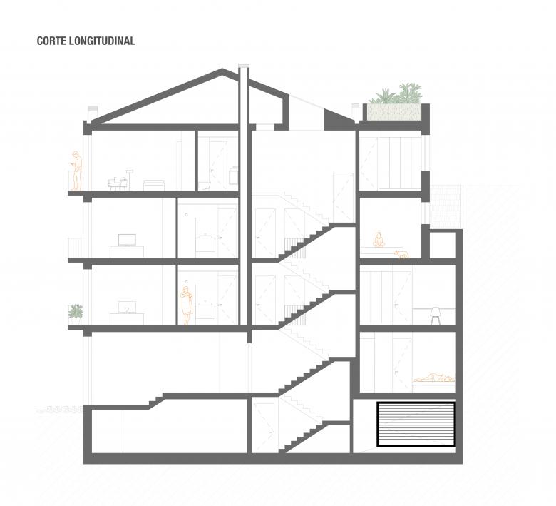 This shy formal freedom of Monte Alegre is the result of its location: the plot is immediately outside the historic center or, better said, at the beginning of the 20th century city. It is an “urban front in consolidation”: a transition zone, where some compositional exercise is already possible, even if with the second intention of sewing and bridging the urban front of its neighbors.