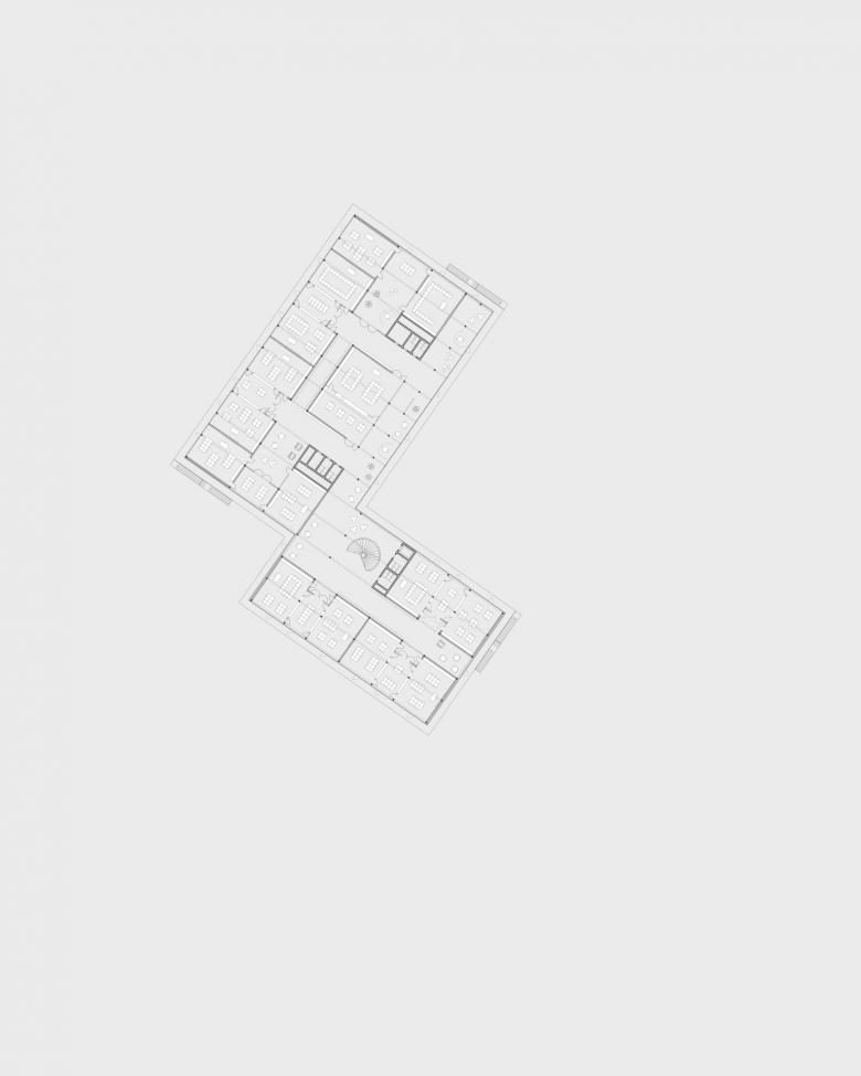 Erschliessung / Zwei Gebäudeteile gliedern das Volumen in einen Sockelbereich und ein darüber liegendes schwebendes Obergeschoss. Dazwischen entsteht eine grosszügig, gedeckte Pausenhalle, welche den zentralen Pausenplatz im Süden mit dem Allwetterplatz im Norden verbindet. Hier befinden sich der Haupteingang der Schule und ein separater Eingang für die Sporthalle. Eine Grosszügige zweigeschossige Eingangshalle empfängt die Besucher und schafft durch die Ausrichtung zum Platz einen Bezug zum Mehrzweckraum in der umgebauten Remise. Von diesem zentralen Raum führt eine überbreite Wendeltreppe zu den verschiedenen Nutzungen und verbindet alle Geschosse miteinander.
