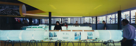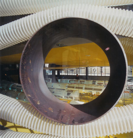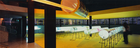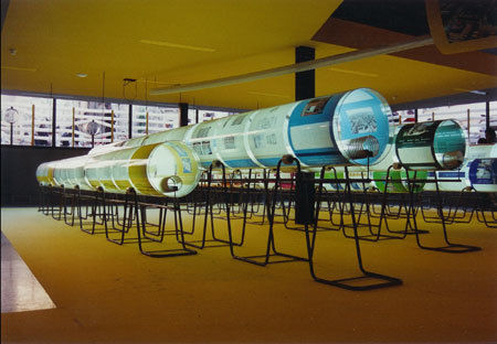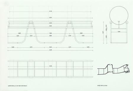 The project faces a double challenge: On the one hand to sort, to present and to provoke the interaction between the viewer and a great amount of information in a space of limited dimensions and on the other hand, given the touring character of the exhibition, the easy assembly, disassembly and transport of its components. The will to intervene in the space without having to box it off led us to sort and divide the information through a sequence of transparent tubes that turn around their axis and display the projects.