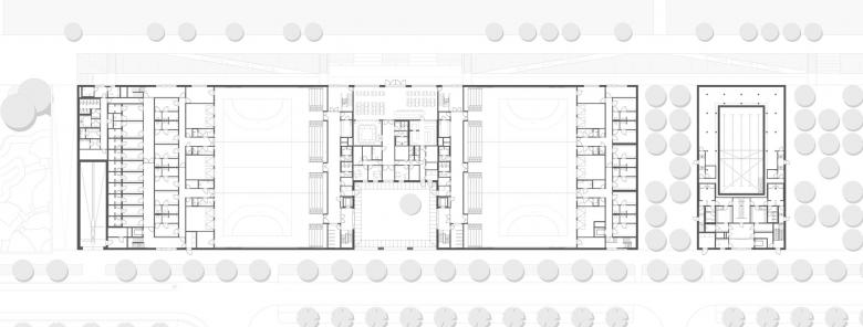 Dem Sportband liegt das Prinzip einer zweiseitigen Erschließung zugrunde, die es erlaubt, städtische Adressen für Sportvereine und Publikum straßenseitig anzubieten und gleichzeitig den Schülern eine sichere Erschließung vom benachbarten Schulcampus aus durch die vorgesehene Unterführung zu ermöglichen. Die Sporthallen und das Schulschwimmbad sind für den inklusiven Schul- und Freizeitsport konzipiert. Darum sind in Abstimmung mit der Landeshauptstadt München sämtliche Sportlerbereiche im Sinne einer inklusiven Teilhabe barrierefrei und für die Nutzung mit dem Sportrollstuhl ausgelegt.