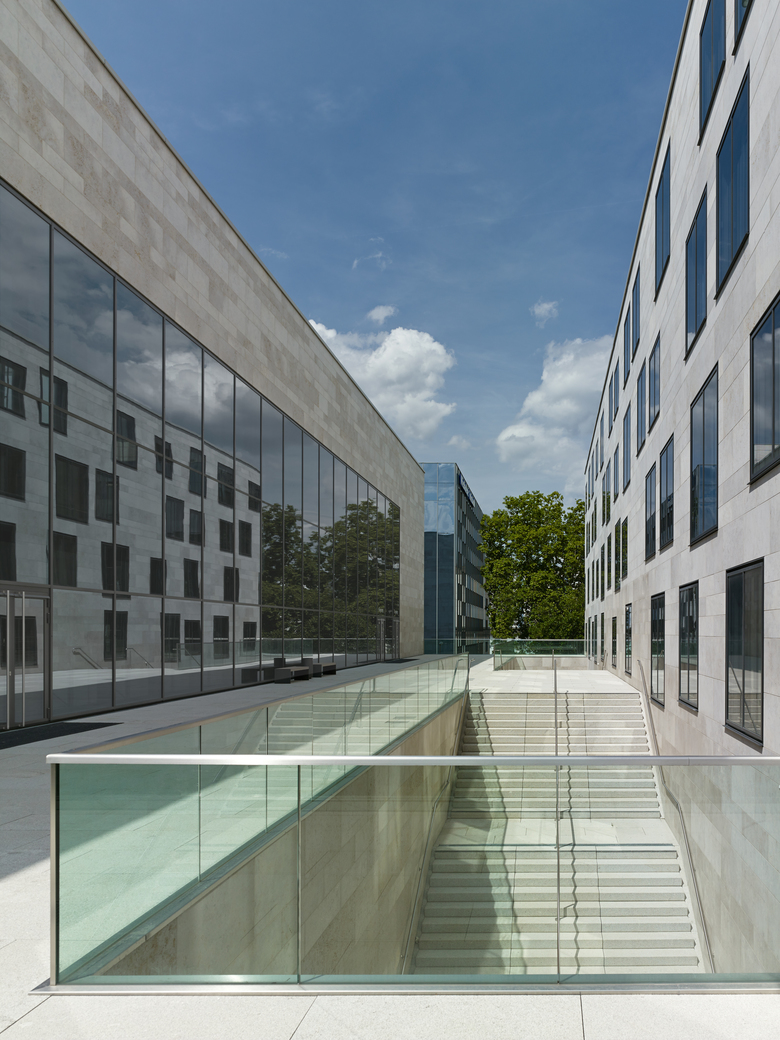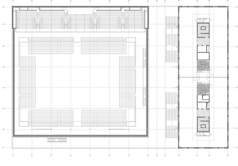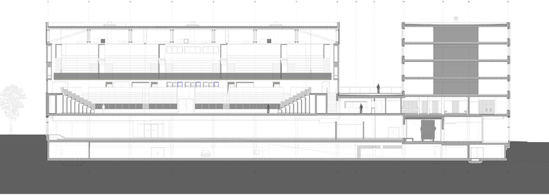 Mit der Neuordnung des Quartiers wird die Intention verfolgt, die jeweiligen Identitäten und Qualitäten der umliegenden Räume herauszuarbeiten und städtebaulich zu stärken. Die programmatischen Vorgaben bedingen eine hybride dreiteilige Baukörperkonstellation, bestehend aus Wettkampfsporthalle, Einzelhandelsflächen und einem Bürohaus, deren spezifische Ausformulierungen sich aus stadträumlichen Abhängigkeiten und funktionalen Zusammenhängen ergeben.