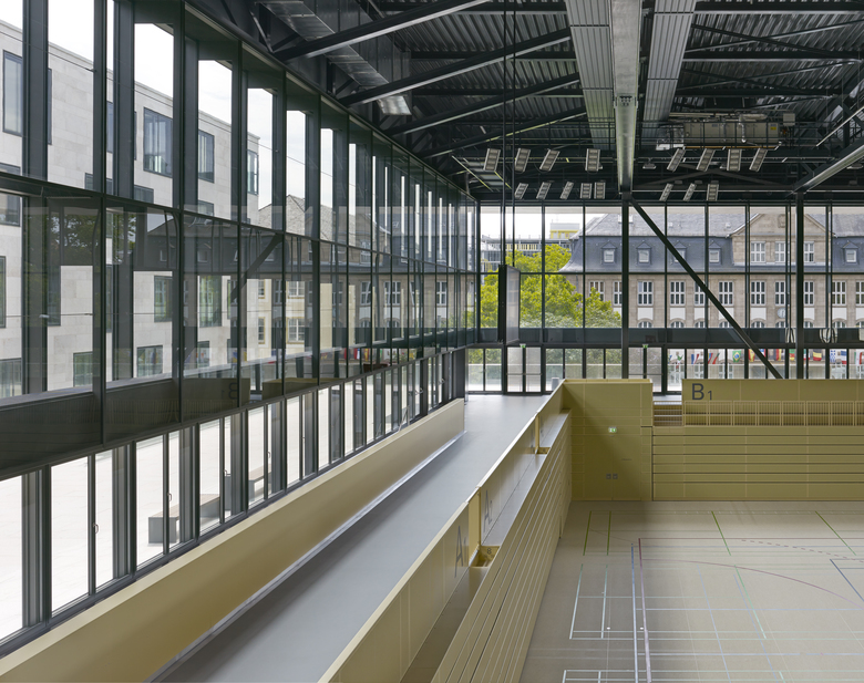 Die neue Sporthalle ist sowohl inhaltlich als auch städtebaulich in engem Zusammenhang mit der bestehenden Elly-Heuss-Schule zu betrachten, welche nun in die erste Reihe tritt und mit ihrem kräftigen Kopf- und Eingangsgebäude ein stadträumlich prägendes Element des Platzes der Deutschen Einheit bildet. Die geplante Ausbildung als Wettkampfstätte für sportliche Veranstaltungen mit entsprechenden Tribünenanlagen erfordert eine räumliche Verknüpfung mit dem Platz und eine über das übliche Maß hinausgehende Ausstrahlung des Sportgeschehens in diesen neuen Stadtraum hinein. Dies wird mit einer großzügigen Öffnung der Sporthalle zum Platz der Deutschen Einheit hin erreicht. Einzelhandelsflächen und Gastronomieeinrichtungen wie Cafés und Restaurants befinden sich in der Erdgeschossebene.