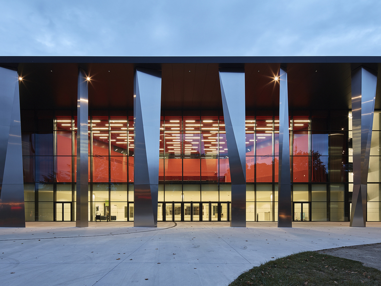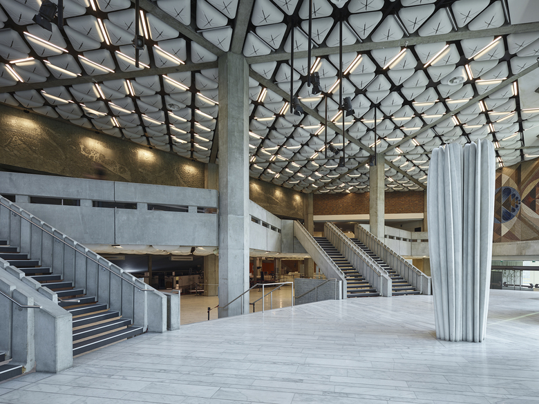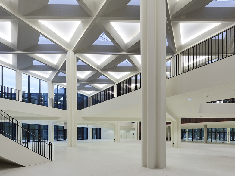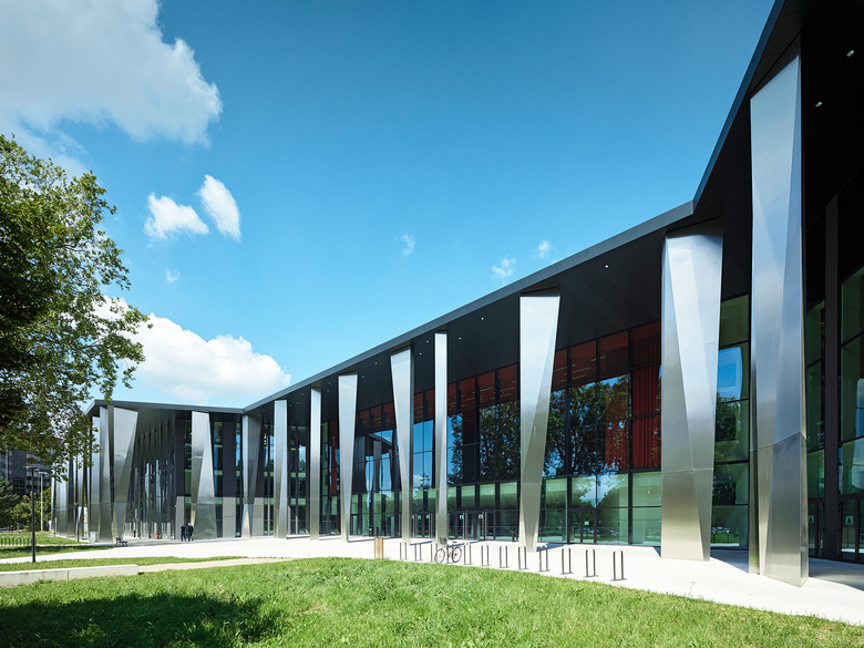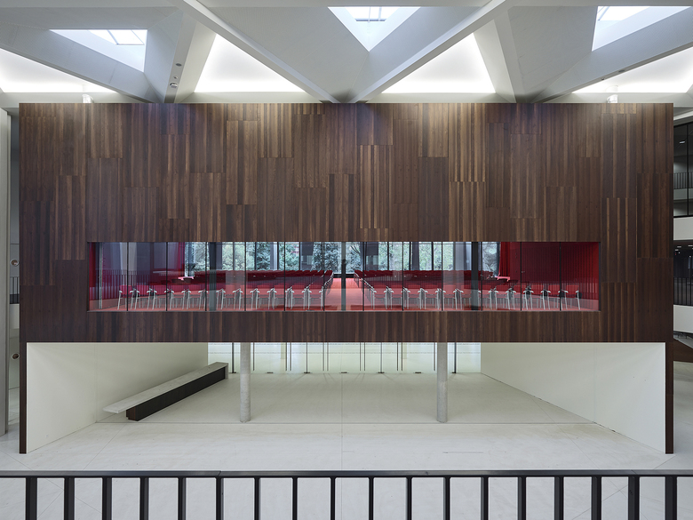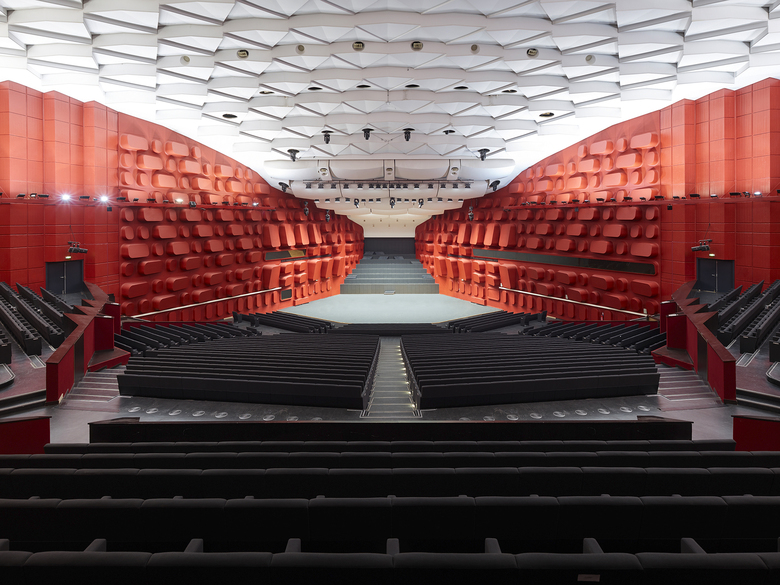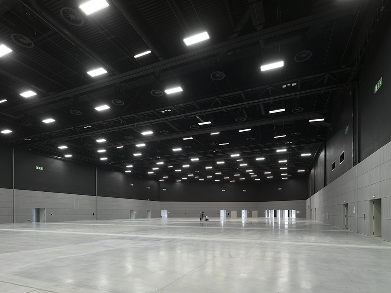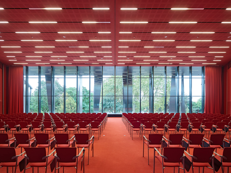 Wir entschieden uns, die vorhandenen Geometrien und das Dreiecks-Motiv weiterzuentwickeln, zu ergänzen und deren Qualitäten gestärkt in den Kontext der Gegenwart überzuführen. Den beiden bestehenden Bauteilen, kurz PMC1 und PMC2 genannt, fügten wir im Südwesten eine 3.000 m² große sechseckige Mehrzweckhalle hinzu. Die bestehenden Säle haben wir saniert und vergrößert. Hinzugekommen sind das kleinere Auditorium „Cassin“, der dramatisch über dem Haupteingang schwebende Konferenzraum „Marie Curie“ und ein neuer Probesaal für das Orchester der Philharmonie Strasbourg. Ein neues zentrales Foyer mit monumentalen Treppen, Galerien und Brücken erschließt die Bereiche Konzert, Konferenz und Ausstellung. Die fast einen Kilometer lange umlaufende Edelstahlarkade fasst die Bauteile aus drei Epochen zu einer einheitlichen Großform zusammen.