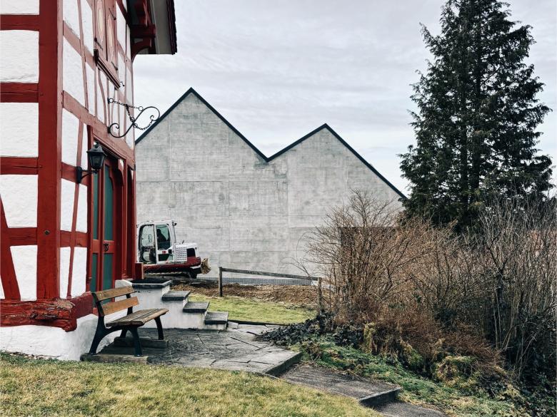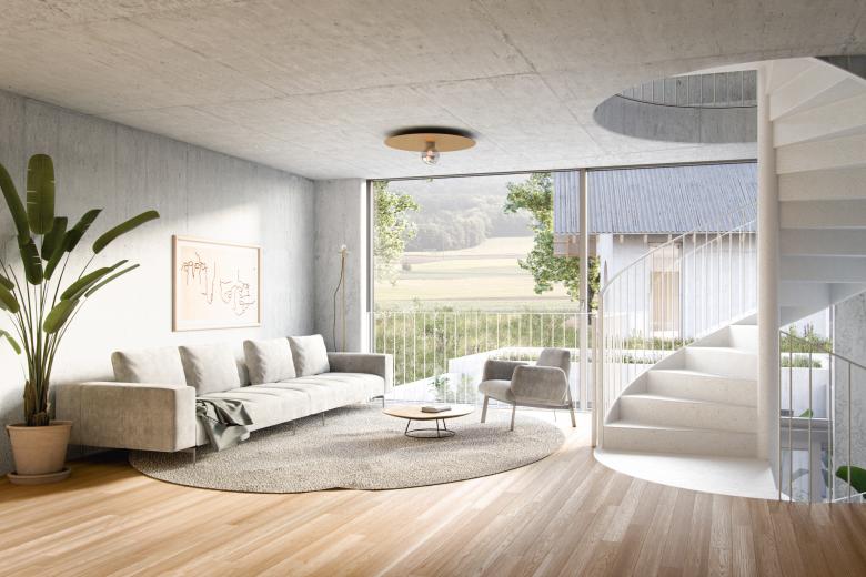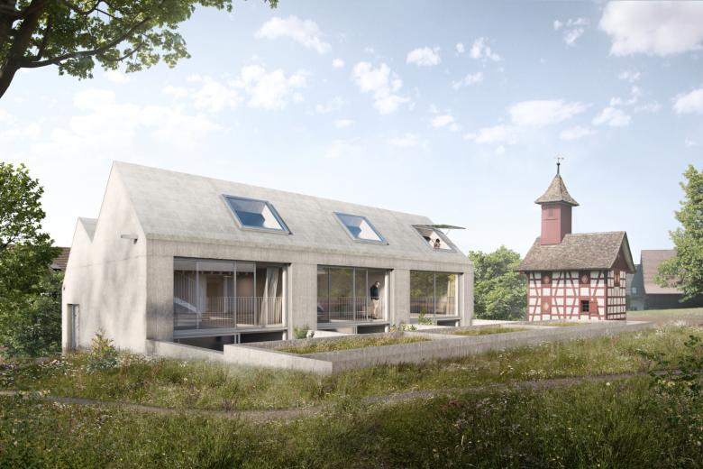 Der Bau schiebt sich in den Hang und ist geprägt von der höhengestaffelten Abfolge von Entrée, Küche und einem vielfältig nutzbarem Atelierraum, der via Innenhof zugänglich ist. Split-Level Geschosse schaffen vielfältige Räume. Ein zweigiebeliges Dach gliedert das oberste Geschoss und verleiht dem Haus zusammen mit der Sichtbetonfassade eine markante Gestalt.