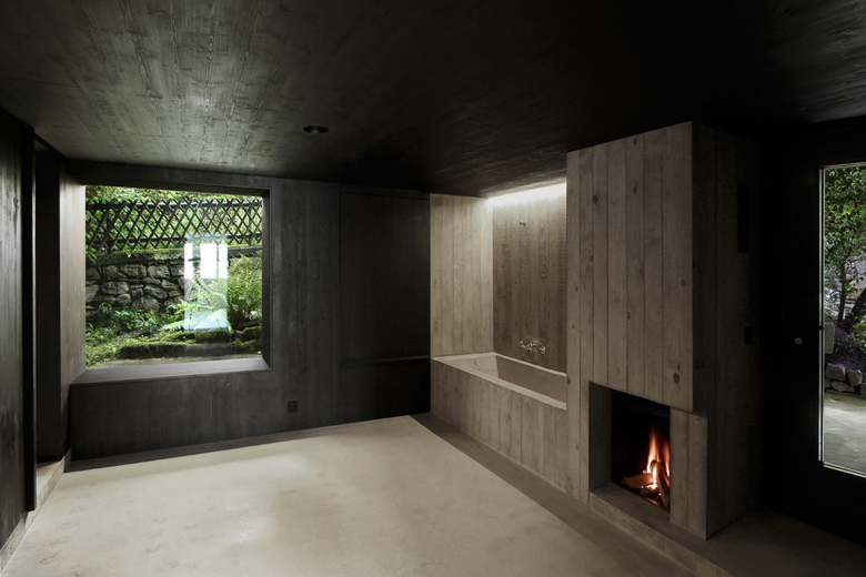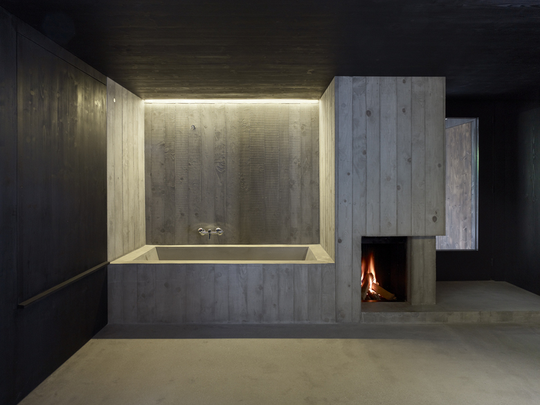 Die Nord-Süd Ausrichtung in Verbindung mit den kleinen Fenstern und einer Raumhöhe von nur 2 Metern liess vor allem die Räume nach Norden, zum Hang hin, eng und dunkel wirken. Ausblicke beschränken sich auf wenige Meter. Im Gegensatz dazu ist der nach Süden ausgerichtete Hausteil hell und profitiert vom reizvollen Ausblick auf den See und die umliegende Berglandschaft. Dieser Gegensatz war Basis der Entwurfsidee, die Räume in ihren jeweiligen atmosphärischen Qualitäten zu steigern. Der niedrige dunkle Raum wird zu einem Rückzugsort nach innen, einer introvertierten behaglichen Höhle. Im Zusammenspiel mit den dunkelbraun lasierten, aus der Umgebung vertrauten Holzoberflächen entsteht so ein Ort, an dem das unmittelbare Nebeneinander von Feuer und Wasser archaische Assoziationen hervorruft. Das neue grosse Fenster mit Sitznische schafft dabei einen überraschenden Blick auf den nun fast japanisch anmutenden Garten.