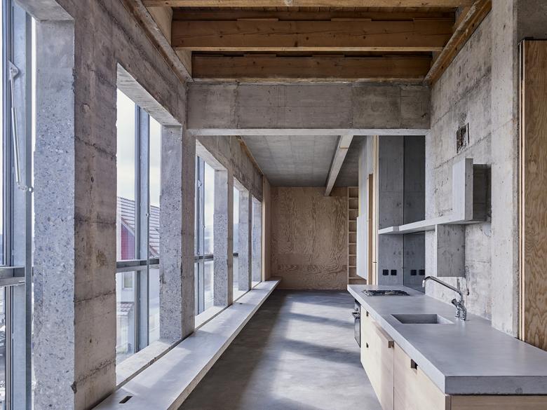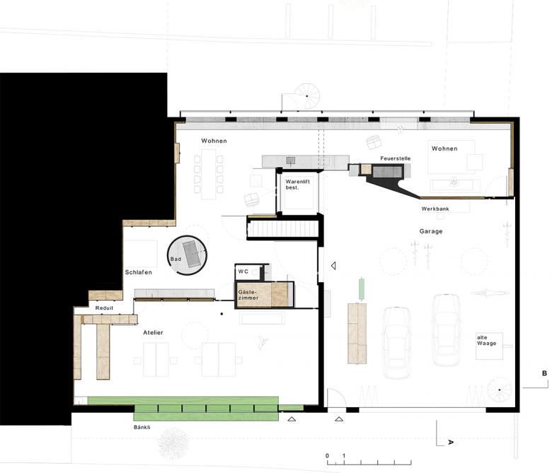 Eine Wohnung und ein Architekturstudio werden eingebaut. Anlieferung und Garage bleiben als Werkstatt erhalten, zusätzlich wird auf die Garage ein kleiner Aufbau gesetzt. Die Zweiteilung des Gebäudes wird talseitig den Fenstern entlang aufgehoben, zugunsten von einem sehr langen schmalen Raum, welcher Küche und Wohnen umfasst. Die bestehenden Fenster mit Brüstungshöhe 2.50m werden auf Sitzbankhöhe heruntergeschnitten. Vor diese Öffnungen wird aussen ein langer Fensterkasten aus Stahl gesetzt.