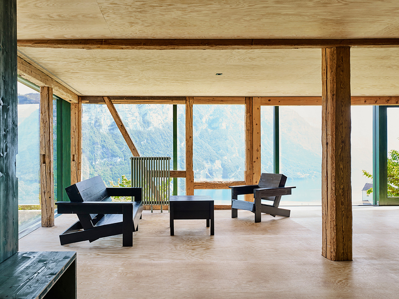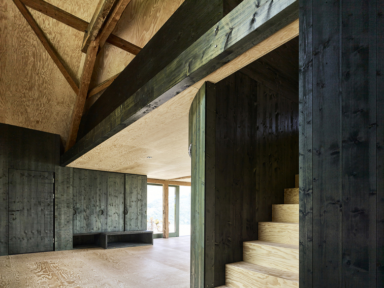 Die alten Ställe hatten Dachstühle, die grosse Räume überspannen konnten. Dieser Umstand wird genutzt und sämtliche nichttragenden Wände werden entfernt, um im Erdgeschoss einen grossen Raum zu schaffen, nur zoniert durch einen leichten, hölzernen runden Kern. Dieser Kern schafft einen fliessenden Bewegungsraum und bildet rundherum Orte heraus zum Kochen, Arbeiten, Wohnen und Spielen. Das Haus wird zum See hin geöffnet: In der Nordost- und in der Nordwestfassade wird ein Fensterkasten mit raumhohen Verglasungen aussen vor die alte Tragstruktur aufgesetzt, der den Blick in die Ferne öffnet. Das ursprüngliche Eingangstor zur Strasse wird als grosses hohes Fenster wieder reaktiviert, um einerseits zum Hang hin den Blick hinauf zum Berg zu ermöglichen und gleichzeitig die Mittagssonne ins Haus zu holen.