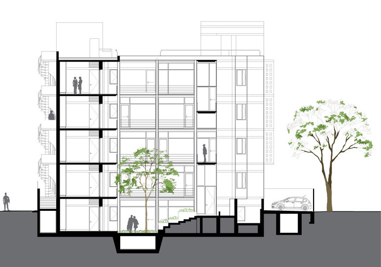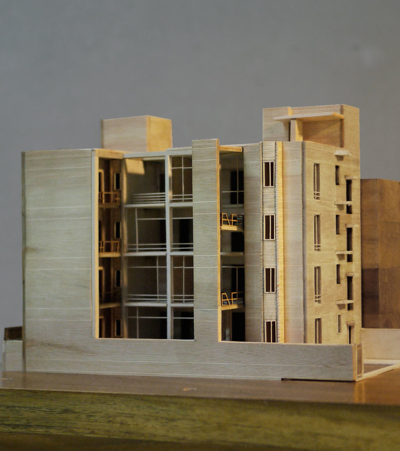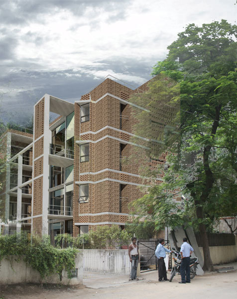 The site for this residence is in South Delhi, on a plot sandwiched between two existing houses. The challenge was to develop three separate apartment units of approximately of 10,000 sq. ft. total built up area while ensuring adequate light, ventilation and open, green spaces for all units. A landscape courtyard was sculpted out of the earth towards the south allowing the winter sun to penetrate into the living areas while floor to ceiling glass allows the indoor spaces to flow out into this green court. The building is designed as a load bearing exposed brick structure with flat slabs. This makes the construction process simpler and faster while allowing for larger volumes and an effortless aesthetic. The spaces ofare organized along a linear gallery that’s forms the spine of the building, providing for efficient circulation as well as the zone through which all services are carried and distributed.