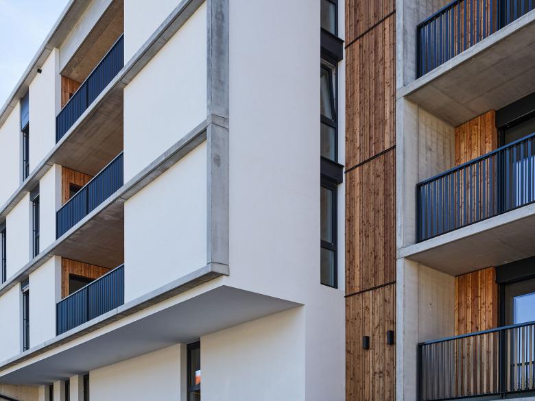 Die Baukörper erscheinen als kubisch geschlossenes Volumen mit verputzten Fassaden mit horizontaler und vertikaler Akzentuierung durch Betongesimse und Lisenen sowie einem rhythmischen Lochbild der Fenster. Teilweise erfolgen Materialwechsel auf Holzoberflächen. Die Balkonzonen werden aus Betonfertigteilen vorgehängt und werden durch den Wechsel von Blumentrögen mit Metallgeländern belebt.