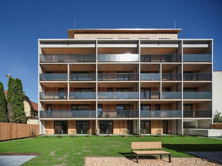 Der Baukörper schließt eine vorhandene Baulücke und nimmt in der Hofgasse die gesamte Grundstücksbreite ein, hier wird das Gebäude Teil einer zukünftig geplanten durchgehenden geschlossenen Häuserzeile mit Arkadenzone. Sämtliche Wohnungen sind nach Süden orientiert und profitieren damit von der ruhigen Gartenzone. Durch das zurückgesetzte Dachgeschoss bleibt die Maßstäblichkeit des vorhandenen Straßenraums, dieser erfährt eine neue Lebendigkeit durch den Baukörper der durch verschiedene Einschnitte und Vorsprünge gegliedert wird. Die Öffentlichkeit profitiert von der neuen Arkadensituation, durch die Anordnung von Nebenräumen an der Straße entsteht keine Minderung der Wohnqualität im Gebäude. Süd- und nordseitig vorgelagerte Balkone gliedern die Baukörper und lassen die Fassaden mit den integrierten Blumentrögen zukünftig zu „grünen Fassaden“ werden.