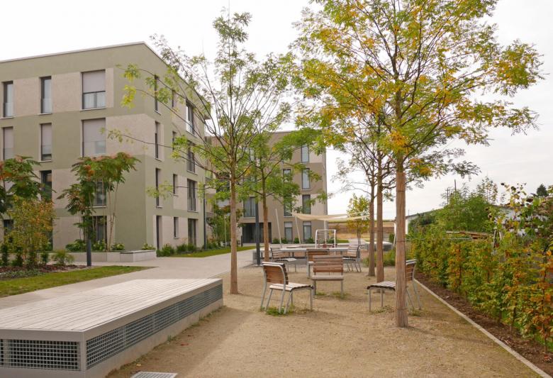 Die Höfe sind mit großzügigen aufgekanteten Baumfeldern versehen in denen sich jeweils mehrstämmige Aralien, Essigbäume und Felsenbirnen als Baumbouqet befinden. In den mit Bodendeckern begrünten Baumquartieren sind an den Enden Sitzflächen aus Holz angebracht, die zum Aufenthalt einladen. Die Übergangsbereiche von Privat zu öffentlich werden mit Gräsern, Hecken, Stauden sowie Sträuchern ausgebildet.