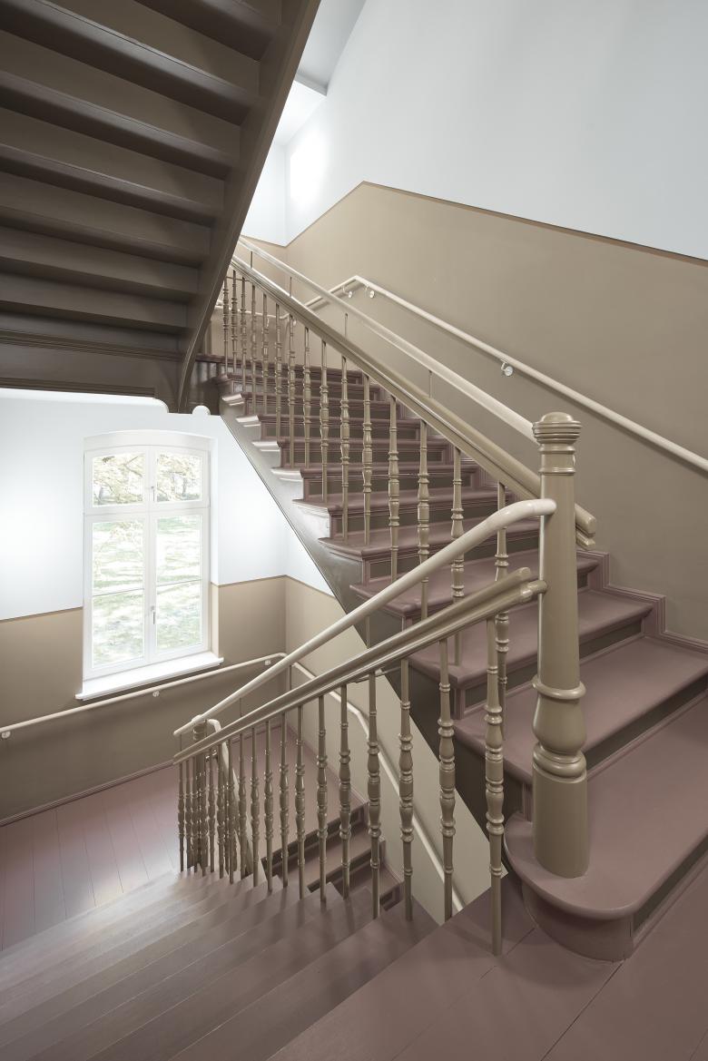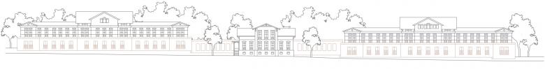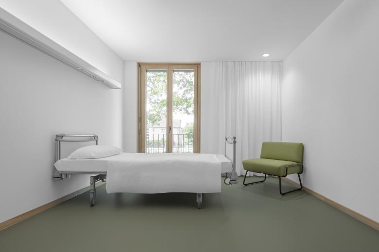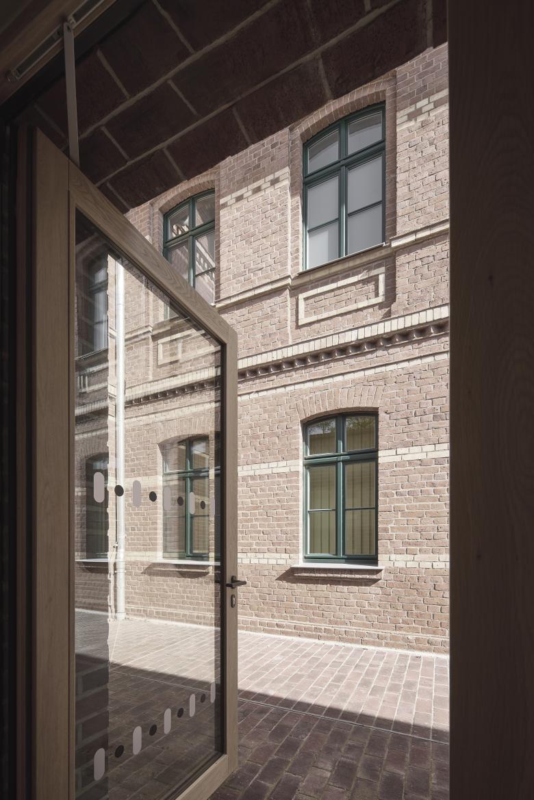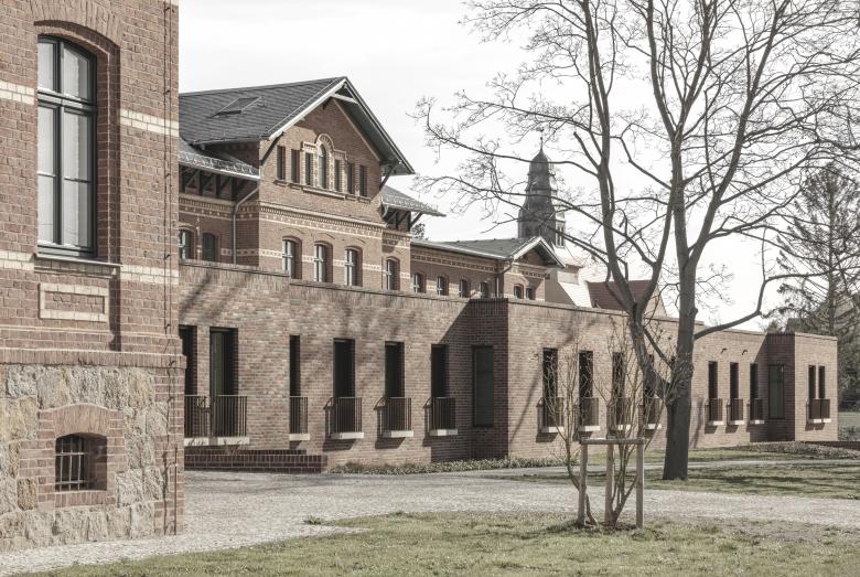 Die Flure des Neubaus binden an die Altbauten an, die Räume erlauben Blicke in die Natur. Die Höhenstaffelung folgt der Topographie, die Form reagiert auf die Risaliten der Altbauten. Die Ziegelfassaden der Alt- und Neubauten unterscheiden sich in Farbigkeit und Details. Die Altbausubstanz wird behutsam an die neue Nutzung angepasst. Die Nachhaltigkeit des Projekts liegt in der optimalen Verbindung der Gebäude. Dadurch ist der Bestand gleichrangig gegenüber dem Neubau, was zentrale Voraussetzung für Erhalt und sinnvolle Weiternutzung ist.