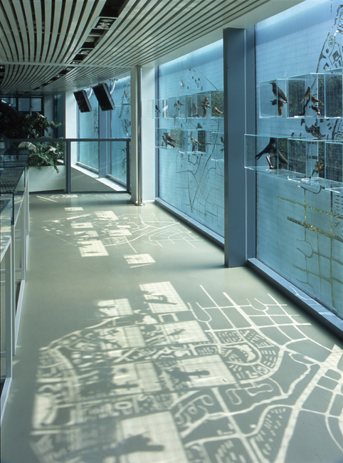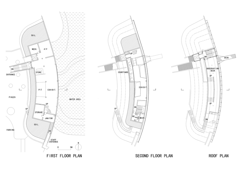 Considering the unique characters of the exhibits, the design breaks away from the “black box” stereotype of museum design, making live species and outdoor natural environment the main exhibits. Rising two stories high, a semi-underwater window nearly 13 meters long shows a complete section of the wetland from its bottom and water body to its shore. The sunken courtyard outside of the west wall on the second floor displays through a window live plants typical in the wetland. Five cameras are installed across the reserve. Visitors can see real-time images anywhere in the reserve by pointing a laser pointer to the corresponding area of a model on the first floor. Finally, the observation deck on the roof affords visitors a direct, panoramic view of the wetland. A cantilevered observation deck extends 7.5 meters into the wetland to allow visitors a closer look of the tree tops and birds.