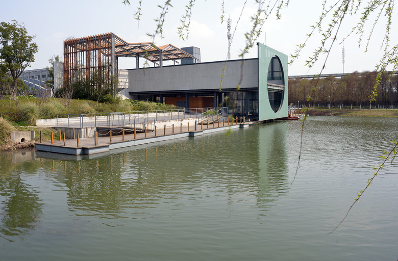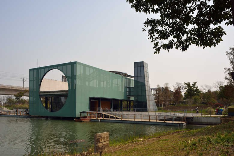 Instead of grabbing attention to its own architectural form, an ideal visitor center should first highlight the contents of the destination to entice visitors into continuing their exploration of the site. Xingxi Park is based on a rational strategy that converts a wasteland, merely glanced over by passersby, into a weekend leisure space for urban residents. If the former is common along highways in the land-rich US, the latter represents a pragmatic solution to the scarcity of land in high-density cities of the Yangtze River delta. The Park also has a straightforward landscape design. Rather than mimicking the Suzhou classical garden style or relying on amusement park rides, the design simply connects the many existing fish ponds and rivers to form a strip of wetland with plants typical of local rural areas. The three-kilometer-long linear plan fittingly accommodates several slow traffic systems, including hiking, biking (7 kilometers long), boating, and a planned horse carriage route. These inexpensive facilities support favorite activities of the majority of residents in today’s Chinese industrial cities.