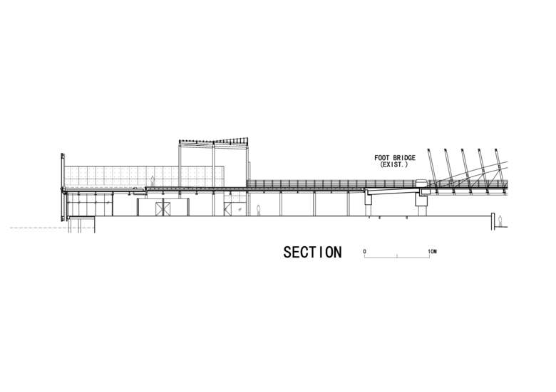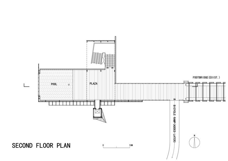 Most part of the building is lifted on stilts to allow maintenance vehicles to pass the first floor. All utilitarian functions are accommodated here. A glass cylinder stands at the west end of the first floor, to be used for tourist orientation and a gift shop. Here people will find that the semicircular gate seen on the second floor is really the upper half of a circular opening, which echoes with the round plan of the shop. The east end of the first floor will be used for bicycle rental, with its own entry and exit. Public bathrooms with wood siding are nested in the middle of the first floor. They appear as an object detached from the building above, stressing the floating feel of the second floor. The west end of the building cantilevers over the river outside, flanked by boat piers on its south and north sides. The open ground to the south of the building will be used as a boarding area for the future horse carriage service. Lastly, both of the south and north sides of the Center are connected to the pedestrian/biking path system of the Park, making the Center a hub of the multiple tourist routes in the Park.