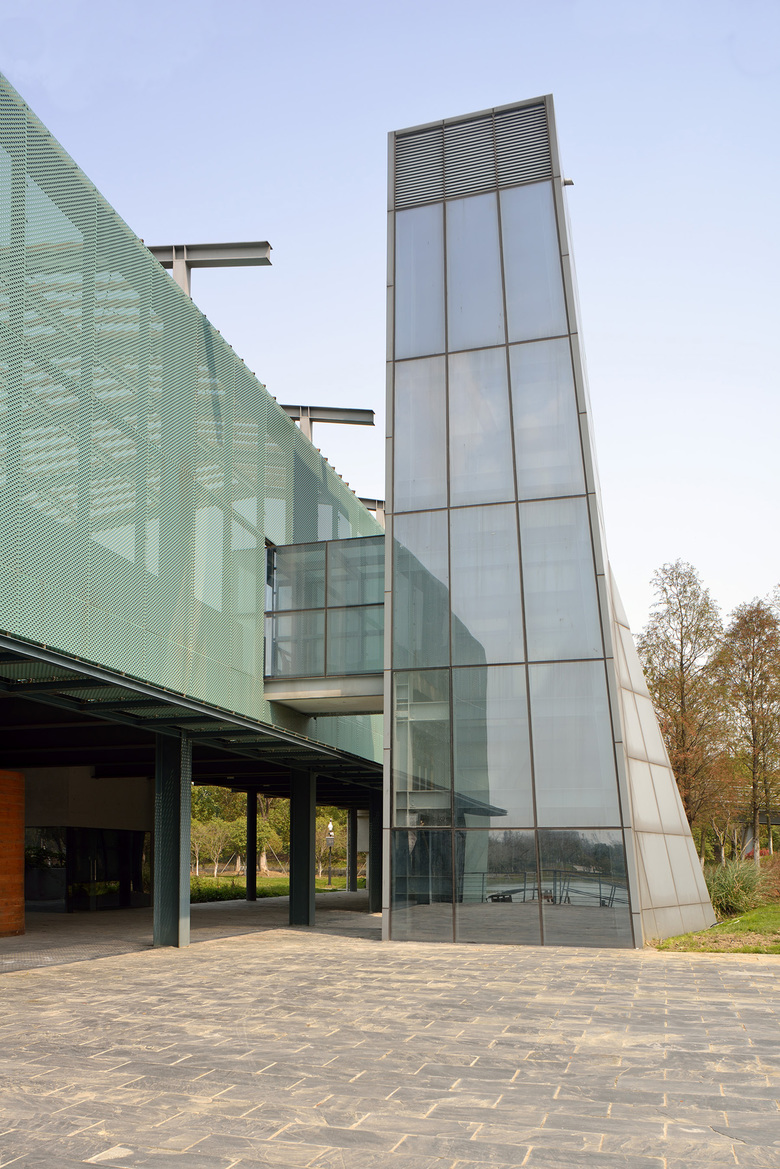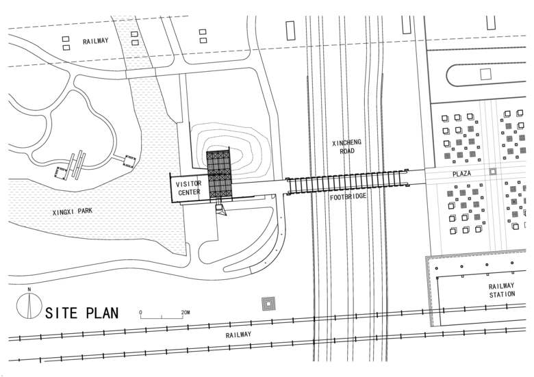 How should the Center present such a simple landscape to the visitors? The site offered an opportunity. The sunken Xincheng Road separates the site from the railway station plaza to its east. An existing footbridge connects these two, with the bridge floor 4.45 meters above the site. Because the railway station plaza has barrier-free connections to the surrounding sidewalks, bike paths, and several bus routes, we placed the entrance to the Center at the footbridge rather than on the ground of the site. Visitors enter the building via the second floor, affording them an overlook of the Park. Three “suspenseful” techniques further enhance the experience. First, the 73-meter-long footbridge is prolonged by an 18.7-meter-long extension, with façade module, floor material and railing matching that of the bridge. Once stepping on the bridge, people’s curiosity is aroused by a glimpse of the distant Center. But only after they pass through the 92-meter-long “corridor”, will they arrive at a second-floor plaza. Perforated aluminum panels and concrete wall of 3-5 meters high surround the plaza, with trellises floating 6-7 meters above the floor, making the plaza a semi-outdoor “hall”. Within it, people cannot see much of the surrounding landscape except through a huge semicircular gate, nine meters in diameter, in the middle of the western wall. Only within this unique framing the Park finally reveals itself. With these two preludes, it is hoped that the ordinary local landscape will appear extraordinary in visitors’ eyes. A shallow pool lies in front of the gate, seeming to lay an illusory path into the Park. But in reality people have to turn right and descend through a grand outdoor stair to the first floor where real paths into the Park begin. The temporary delay produces yet another suspense to strengthen one’s desire to explore.