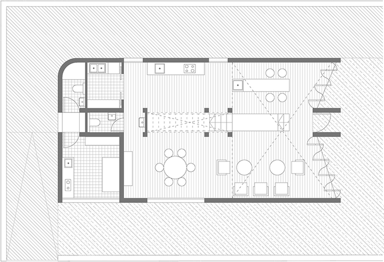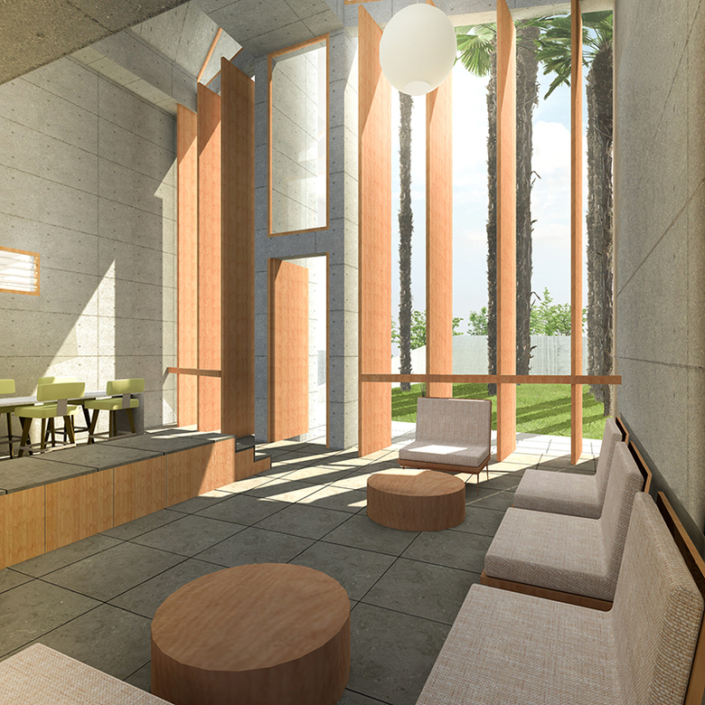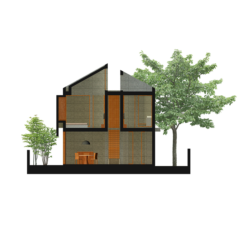 A proposal with an inherent paradox, a small weekend house  for a large family on a small piece of land prompted us to look at the existing rural typology. The contrast in the brief lead us to develop the house as a small barn house, prevalent in the backyards of the large main houses in that region; leaving  open yard in front.  The ground floor with small footprint expands in volume to merge with the yard in front  through tall doors along its length. The yard is planted with coconut trees at close distance, which can grow tall to form a large seamless canopy  as an extension to the roof of the house and yet leave a lot of space for children to run around its slender trunks and people to laze about in the sunny afternoons. The coconut trees also blend with the surrounding orchards in this seaside village. The upper floors are seen  as  compact pavillions to merely rest and rejuvenate; where the plants, breeze and the light sway by from different sides.