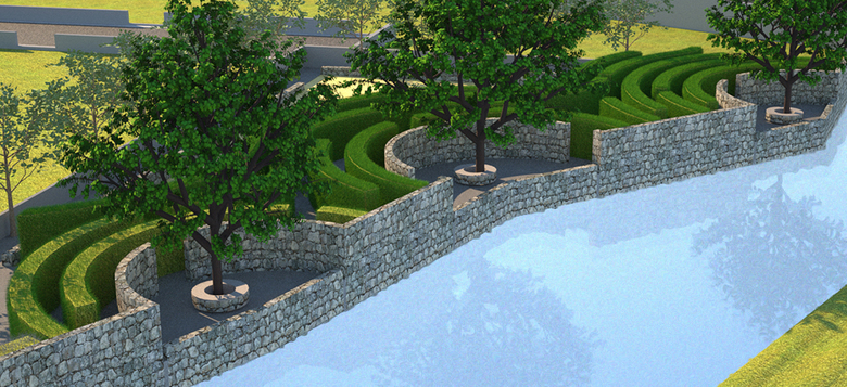 The strategy of landscaping was to lure people from all age groups by weaving possibility of activities into it. A series of interconnected maze of hedge interspersed with stone alcoves was developed along a long stretch that would allow people to fool around or introspect. An amphitheatre was carved into a sloped crescent formed by the stream that turns it into a stepped public place for performances for or by the people. A boomerang shaped velodrome of a sort was evolved in a wedge shaped piece that could be used for strenuous walk or just an arena to sit back and watch others enjoying skateboarding, slides, see-saw or a swim in the stream.