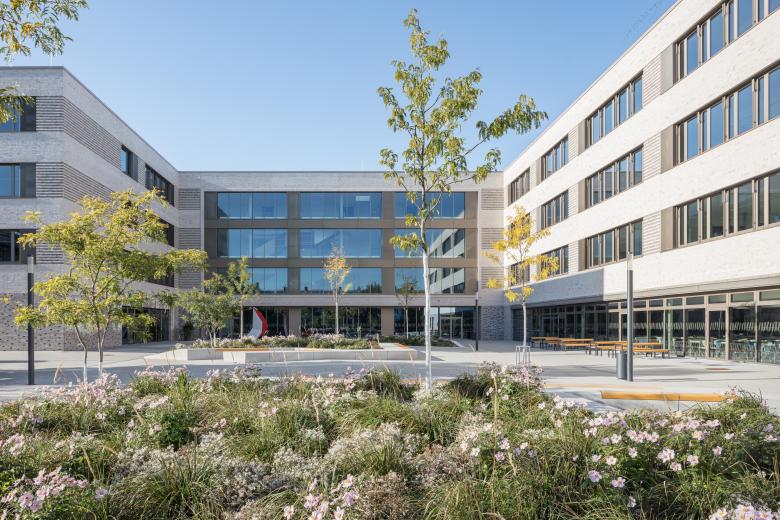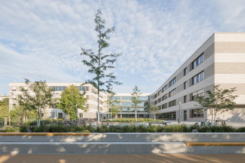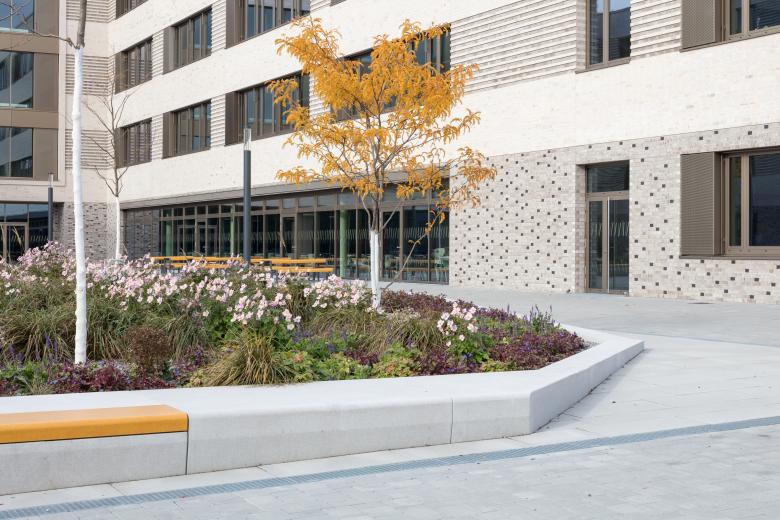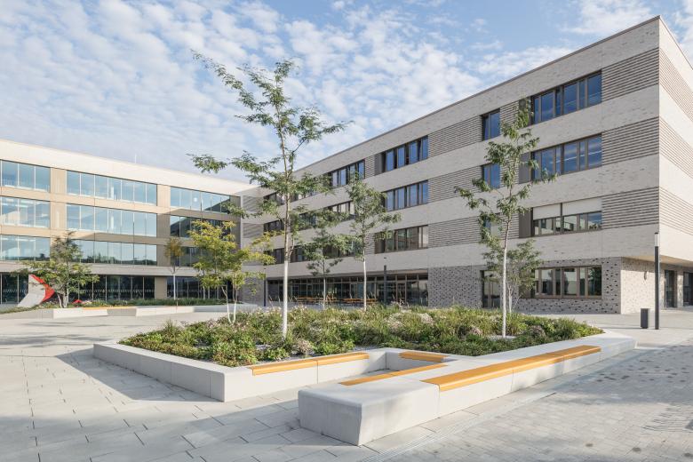 Südlich des neuen Schulhauses öffnet sich die Pausenhof- und Freifläche mit unterschiedlichen Aufenthaltsbereichen und Besonnungssituationen. Durch eine leichte Modellierung des Geländes an den Grundstücksrändern und eine artenreiche Bepflanzung in den mittleren Pflanzinseln mit Splittbelag, werden grüne Puffer innerhalb des Pausenhofbereiches und auch zu den angrenzenden Wohngebäuden entwickelt. Bänke und Sitzstufen mit Sitzauflagen laden zum Treffen und Verweilen ein. Die linearen Bänke, die die Radiusform der Gebäudeecken aufgreifen, begleiten undumfassen die Pflanzflächen. Der wertvolle Baumbestand kann in Teilen erhalten werden. Neue Bäume werden im Bereich des Pausenhofes, und begleitend zu den Stellplätzen gepflanzt.