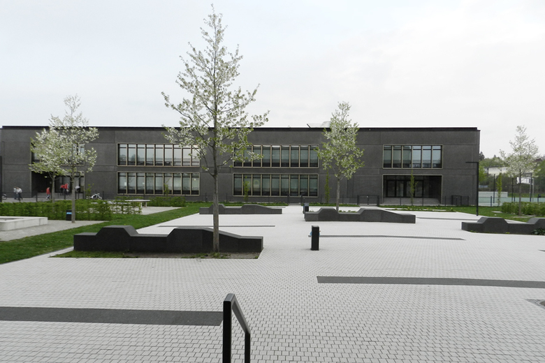Die Außenanlagen für den Neubau der staatlichen Realschule gliedern sich in drei Bereiche, den durch das Gebäude gefassten Pausenhof, den linear ausgerichteten und kompakten Sportbereich, sowie den Vorplatz auf dem die Baukörper stehen. Der Pausenhof versteht sich als Kontinuum des Schulgebäudes. Die hell gepflasterte Fläche ist durch Plattenstreifen und Sitzgelegenheiten gegliedert, die sich aus dem Fassadenspiel ableiten. SolitärBäume markieren den Hof und die Freifläche. Umgeben ist die befestigte Pausenhoffläche von Aufenthaltsbereichen die durch Hecken gegliedert, dem Spiel, dem Lernen und der Erholung dienen. Die Sporthalle und Sportfelder grenzen alle an die Nordsüd verlaufende Erschließungsachse, die mit einer Baumreihe aus Säuleneichen gekennzeichnet ist. Der Vorplatz mit Eingangsbereich und Erschließungsflächen stellt sich als gepflasterte und funktional gegliederte Fläche den gestellten Anforderungen.