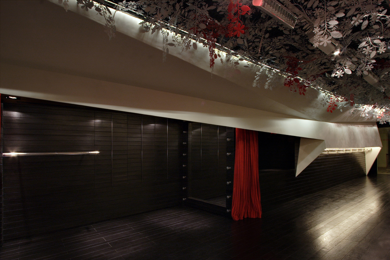 The design consists of two folded white planes suspended inside a dark wooden box. Contained within these planes are various functional requirements, from the main garment display racks [lit from above] to the AC ducts and vents. The cash counter was also tucked behind one of the planes, as is the large dressing area which is closed-off with a thick red curtain. Suspended from the metal trellis false-ceiling are hundred of flowers, lazer-cut from sheets of acrylic - a boisterous assemblage that offers a striking contrast to the straight lines of the folding planes below.