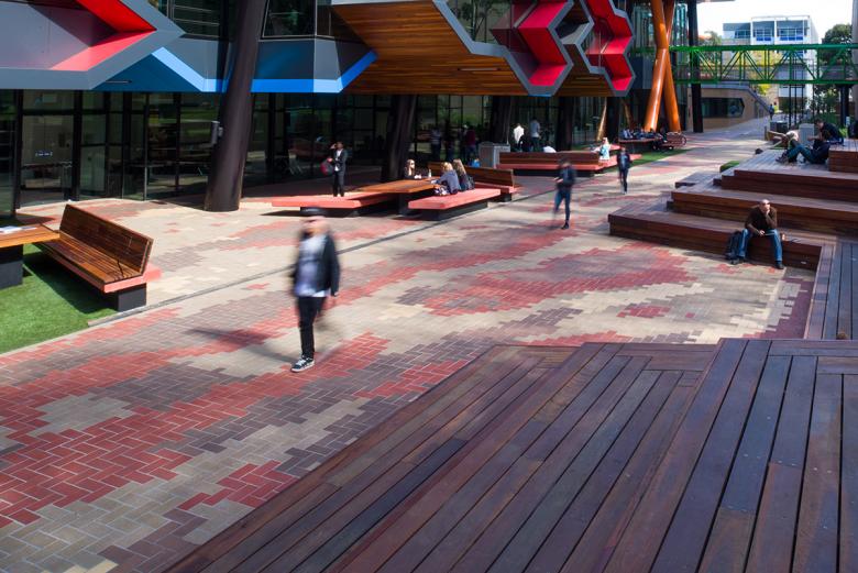 The rich green of the turf, soft palette of native plants, warm toned colours and textures of the furniture compliments the brick palate and provides an interesting and unique campus landscape that contributes to the wider environment and student life in all facets of their day to day lives.