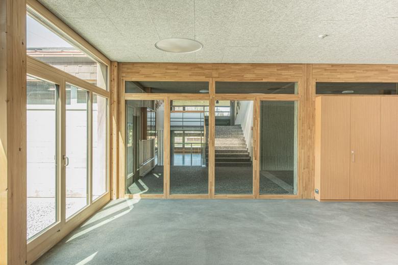 Die heute zweiteilig gegliederte Schulanlage wird mit einem kompakten Ergänzungsbau erweitert. Im Erdgeschoss verbindet die neue Eingangshalle die drei Gebäudeteile Turnhalle, Aula/ Spezialtrakt und die neuen Lernlandschaften zu einem zusammenhängenden Schulkomplex. Der Unterricht findet in Zukunft in Lernlandschaften statt. Je drei Klassen werden zusammengefasst und arbeiten in der offenen, zum Grünraum ausgerichteten Lernlandschaft.