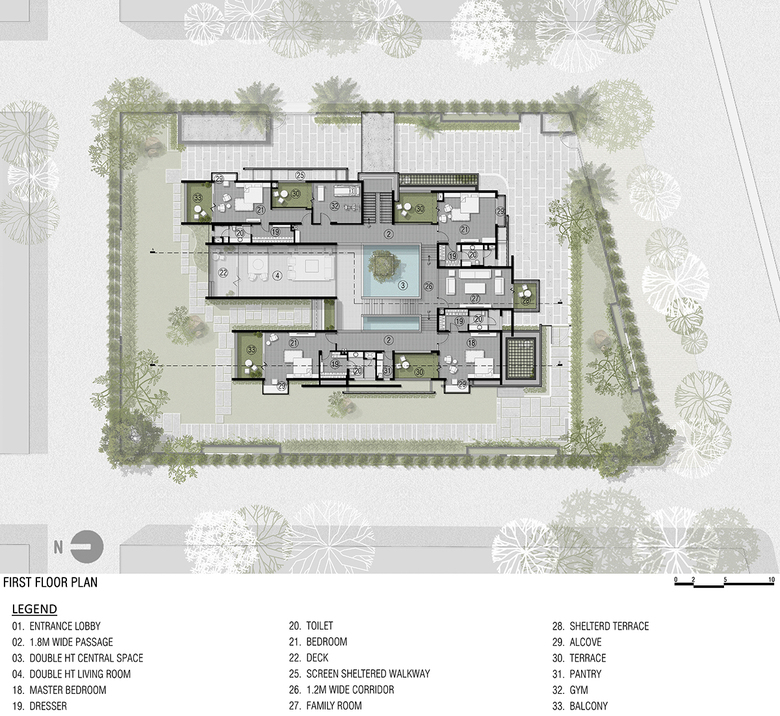 The extensive requirements of the 6 bedroom house are interspersed with sheltered open terraces and landscaped gardens around a 2 floor high naturally ventilated courtyard.