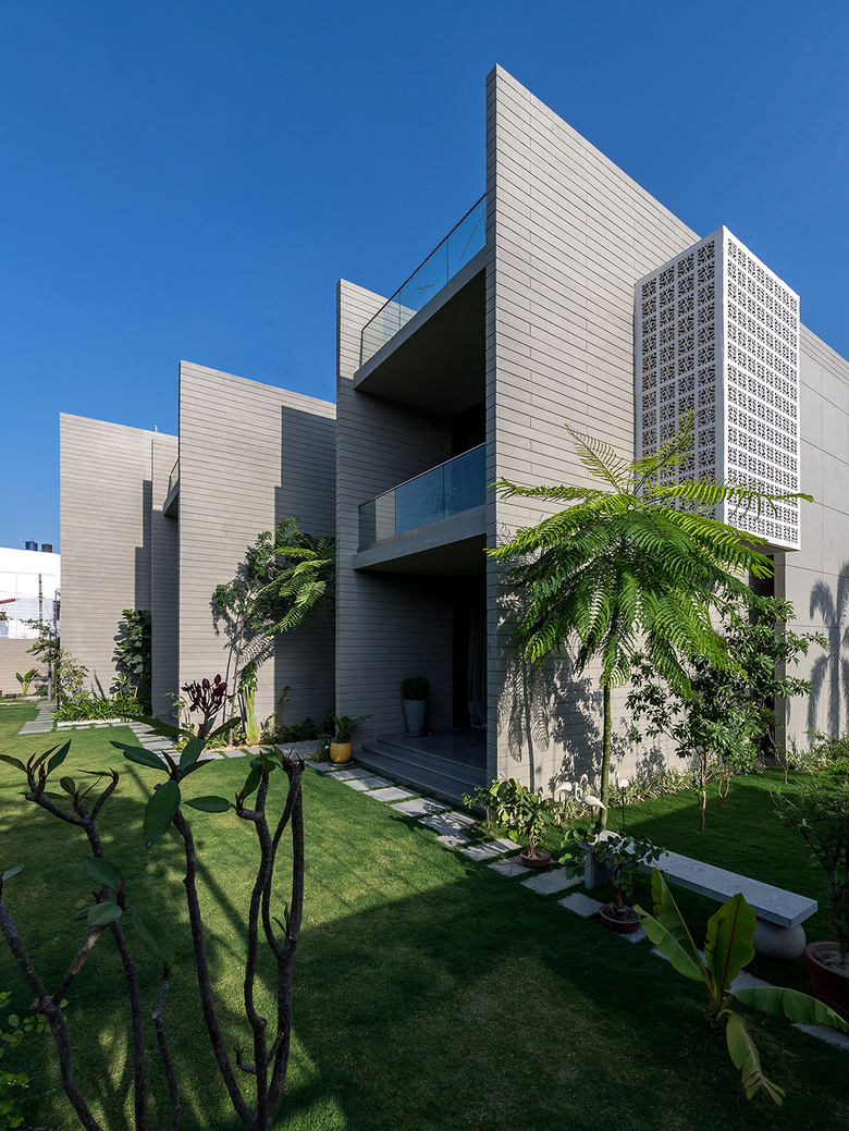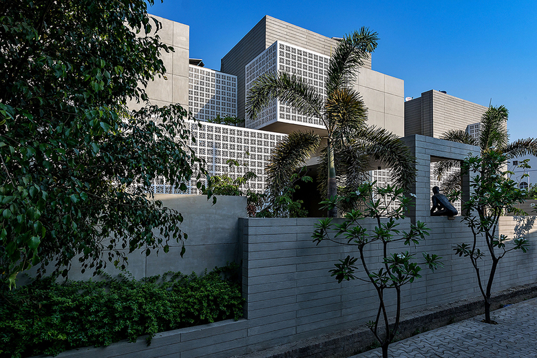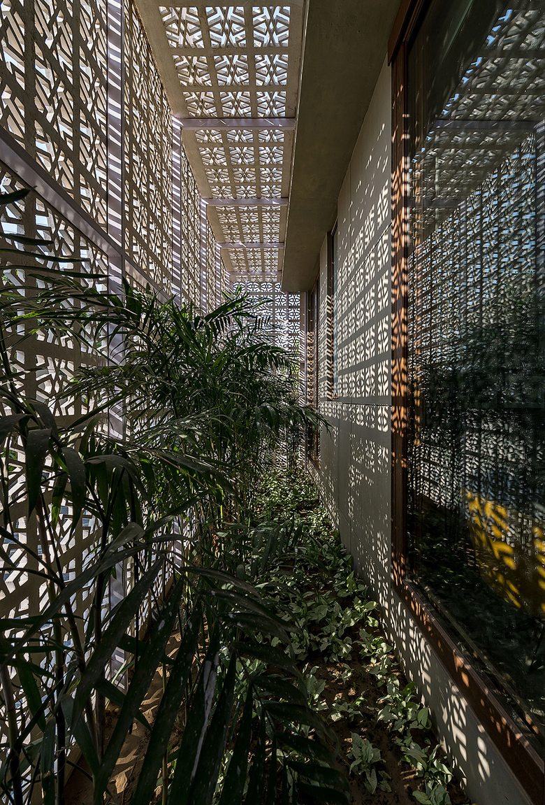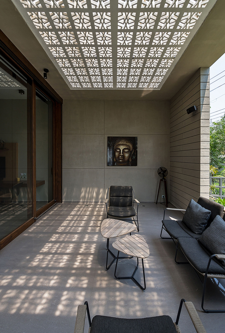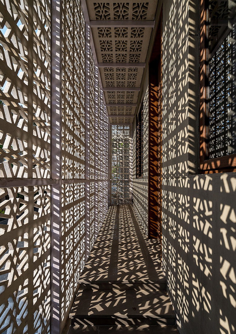 Patterned screens derived from traditional Indian architecture and the famous Lucknow 'chikan' embroidery sheath outdoor seating areas for each room on the south, west and east sides. These screens provide shelter from the sun, create different light patterns throughout the day and mitigate traffic noise from the busy arterial road on the southern side.