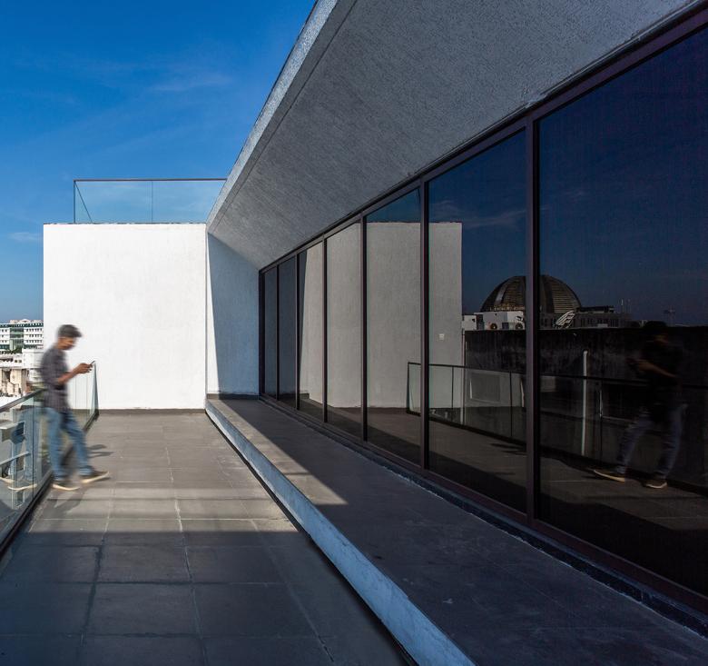 The offices divisible into 4 at a level with varying sizes from 165 to 270 sq meters cantilever out at the first floor and step back and forth creating linear north-facing terraces on every floor.