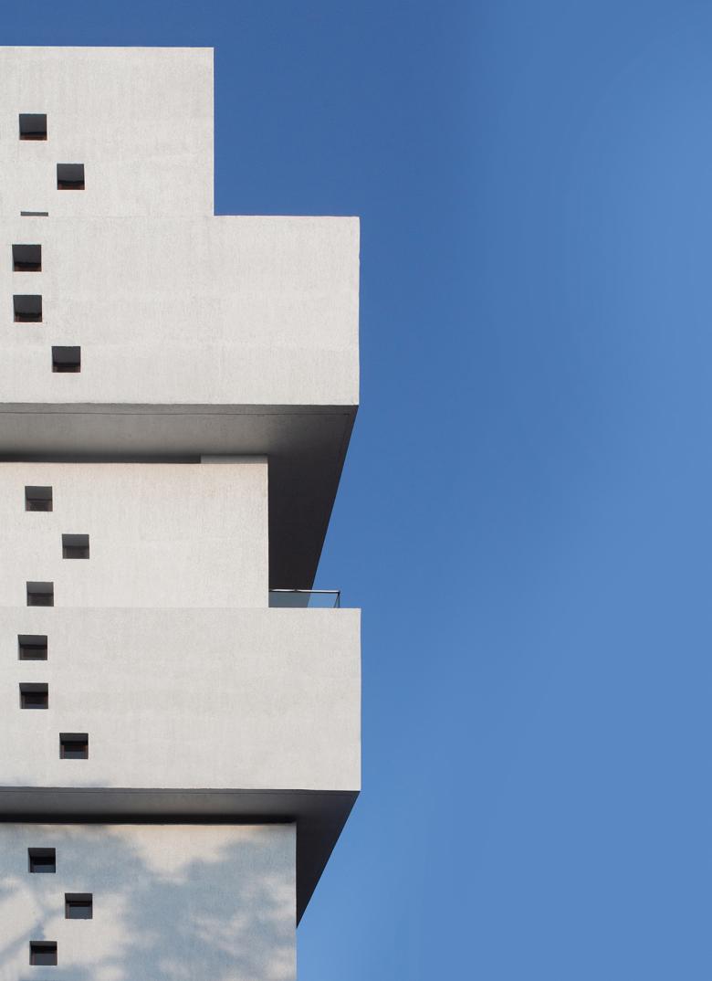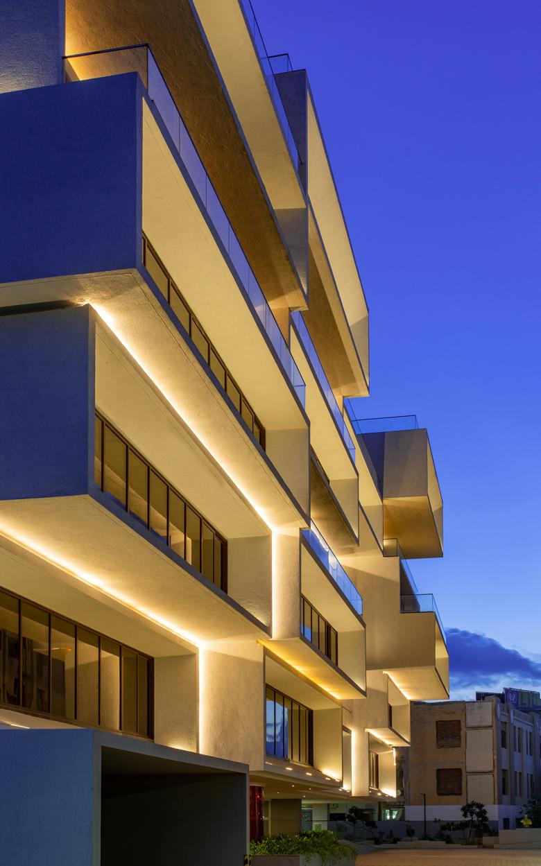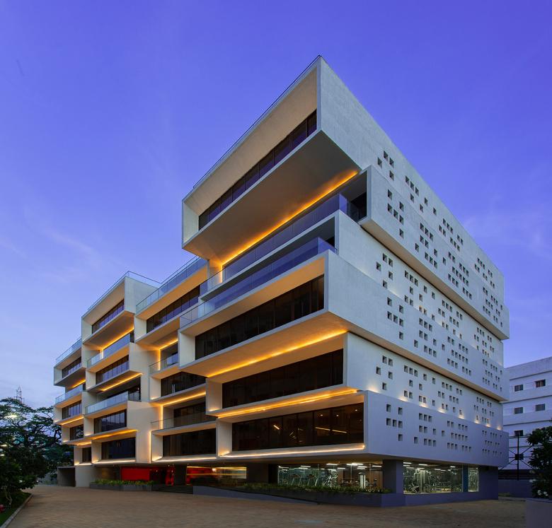 Cantilevered cuboid volumes create a sculptural office building in Chennai, India. Located in the old business district of Chennai in South India, the plot had multiple challenges to be overcome.