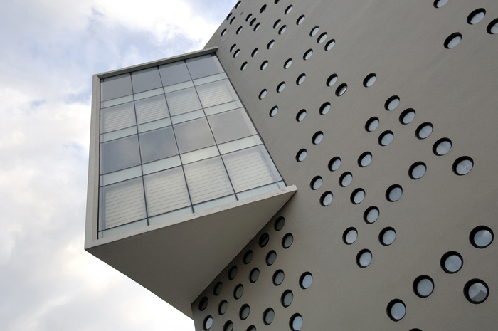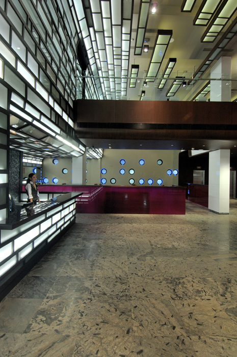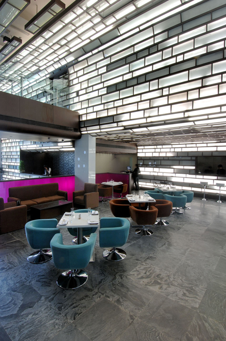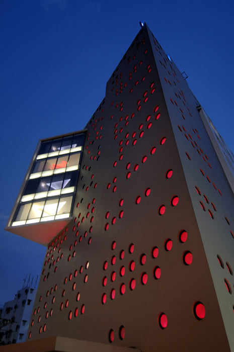 The hotel is planned in eight levels with public spaces occupying the first three levels and four levels of rooms above with a rooftop lounge bar on the topmost floor. Since there was nothing in the surroundings to look out to at the lower levels, the entire volume comprising of the public spaces and the vertical circulation is punctuated by small 45 cm diameter circular openings. These openings allow natural light into the public spaces at daytime and are made of frit glass so that the exterior is purposely not seen and the public spaces have an identity of their own once one enters and experiences them. Each opening is lit by LEDs during the evening hours that change colour as the night progresses, making the building dynamic as it glows in different hues like a large punctuated lantern.