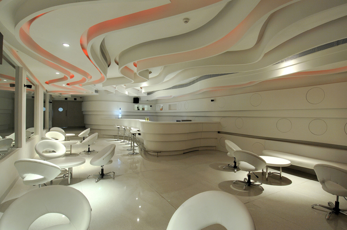 The topmost floor houses a lounge bar with an open terrace along its length. The bar being small in area is designed in a fluid manner that allows it to be perceived as a larger space while being rendered in a sculptural way. Undulating curved ribbon shaped panels are suspended from the ceiling with reflected colour change lighting between them across the length of the bar. The walls and the bar counter are merged fluidly with curvilinear panels of varying widths and projections. Complete white rendering of all the design elements allow the bar to be completely transformed by colour change lights at intervals, creating different moods.