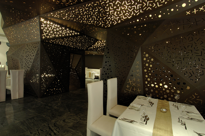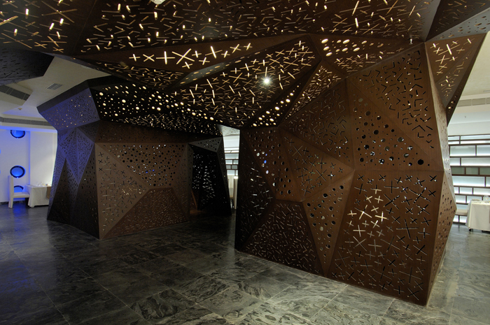 Angled trapezoidal planes, punctuated with varied compositions, fold down from the ceiling to create two private dining areas within the restaurant space and fragment the volume into smaller spaces that are lent more privacy. The restaurant design thus creates compositions of form that are varied depending upon which part they are being perceived from.