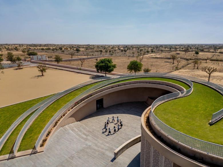 The ovoid library is sheathed in natural sandstone screens derived from traditional architecture in Rajasthan, with the stone being sourced from the immediate surrounding area.