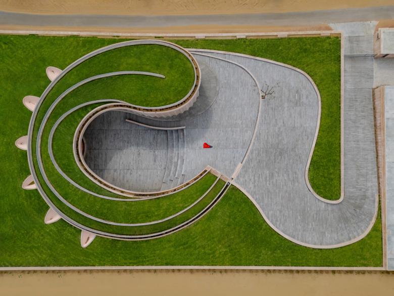 The main spiral building of 9,000sqft becomes an inclined garden with two varying slopes, allowing it to be used for recreation and gatherings, and offering views of the surrounding desert landscape from the rooftop.