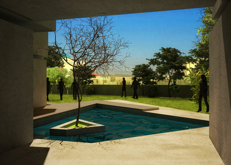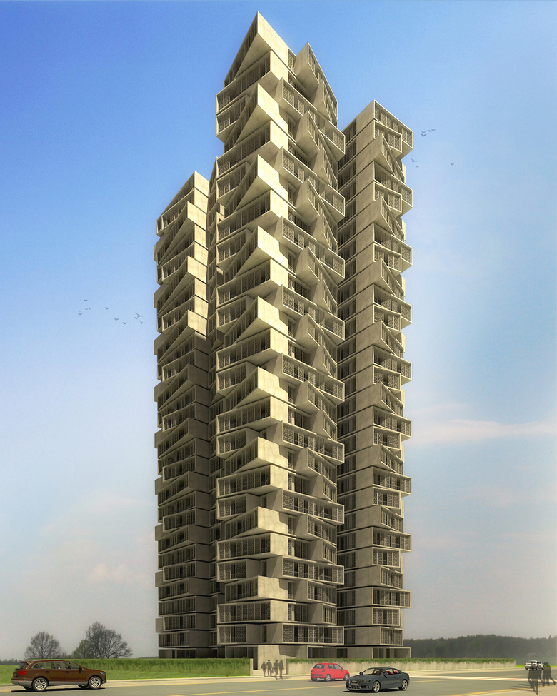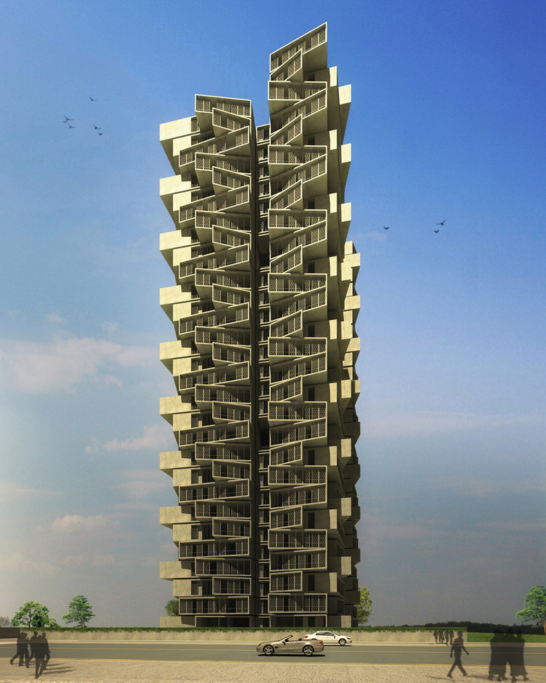 Each apartment being rectilinear in plan is fronted by angled balcony spaces that twist on each floor to create an individual identity of the apartment while providing sheltered transitional spaces between the interior and exterior and thus resulting in reduced heat gain within the apartments. It is planned in a manner to facilitate cross ventilation, since the location has Southwest breeze throughout the year.