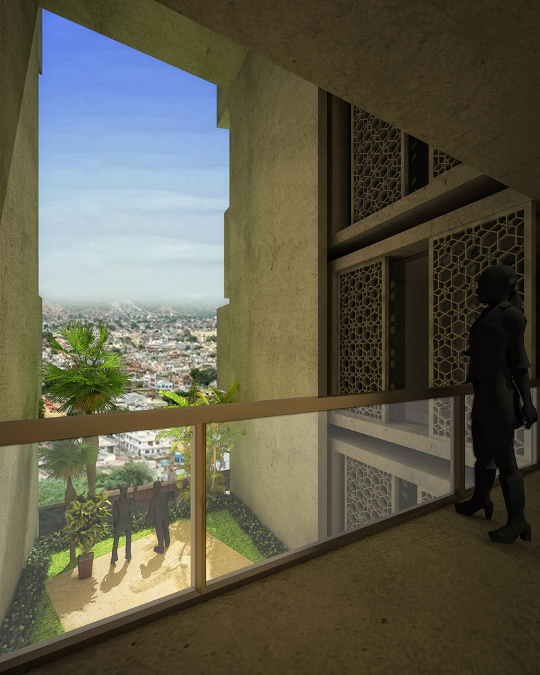 Sanskriti, although not a very high building, with its location in Jaipur, a fast growing urban city in Rajasthan in India which is predominantly low rise, makes it a very tall structure in its context. The building is therefore designed in a seemingly organic way. Sanskriti is a 27 storey residential building with its built up area being six times the plot area; the highest one can build after the revision in local regulatory guidelines that earlier allowed only a 1:1 ratio of Built-Up area to the plot size.