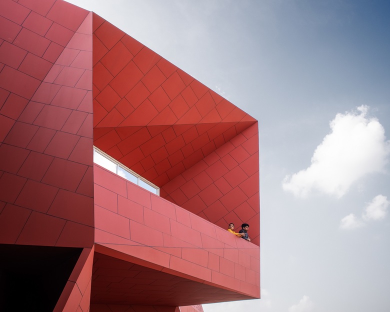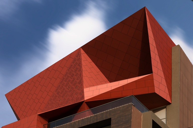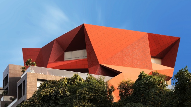 The owner of the development wanted a clearly discernible office space of 500 sq meters. Angular folded planes create this office, set back from the road junction at the north-west corner, punctuating the rectilinear composition of the rest of the building. Created with rust-red colored solid aluminium sheets this angular office volume is nestled within an open north-oriented terrace. This office space is deliberately designed to contrast with the rest of the building creating an interesting juxtaposition of color, volume & geometry in addition to creating an individual identity based upon the brief. The simple rectilinear geometry with muted color tones & the complex angular geometry awash with color contrast to create a unique composition.