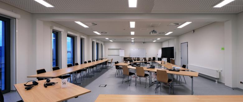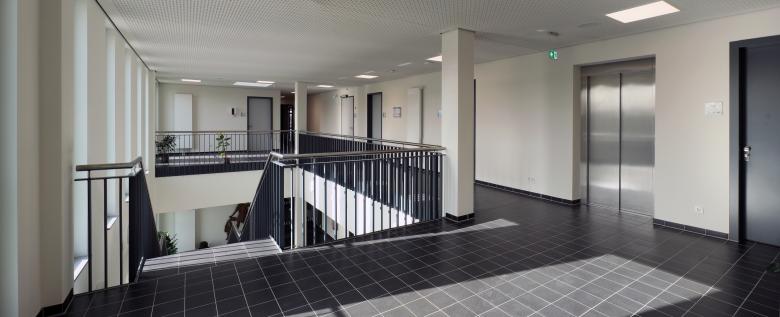 Dem Verwaltungsriegel ist ein eingeschossiger Baukörper vorgelagert. Ein Rücksprung in der Fassade schafft einen Vorplatz und akzentuiert so den Hauptzugang zum Gebäude. Vom zentral gelegenen Foyer mit der Haupttreppe verteilen sich die Verkehrsströme in die einzel- nen Bereiche. Ein Luftraum verbindet die Geschosse und sorgt für einer gute Orientierung im Gebäude. Die Flurbereiche in die einzelnen Nutzungseinheiten werden soweit möglich entlang der Fassade geführt bzw. durch Oberlichter natürlich belichtet.