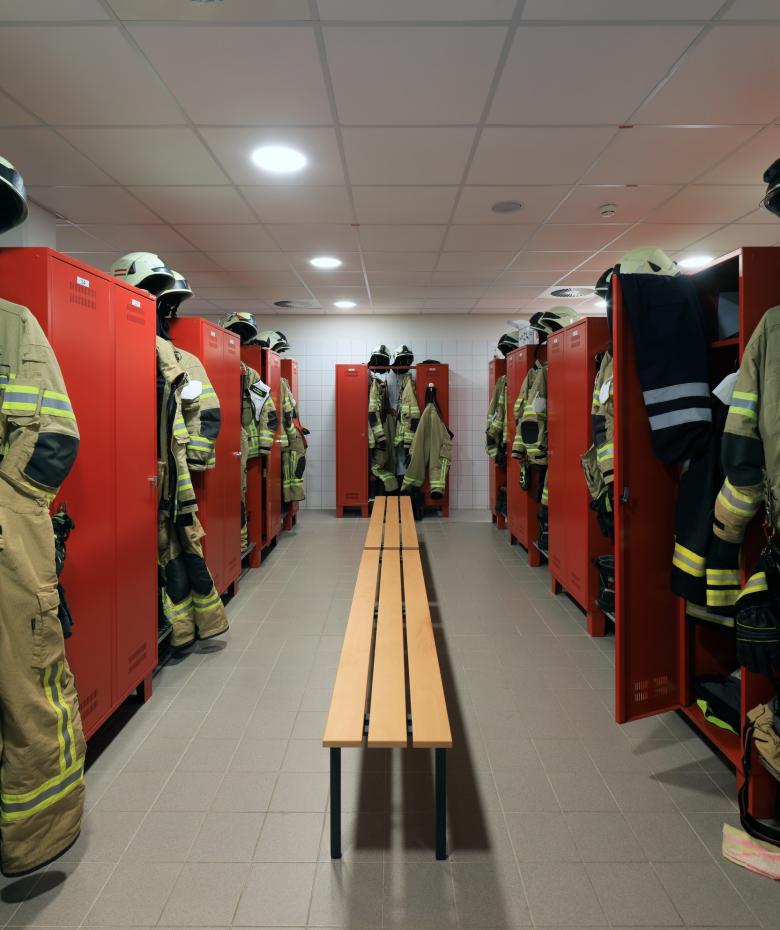 Die Anordnung der Umkleiden für Stadt- und Ortsfeuerwehr gewährleistet eine leichte Orientierung für die ankommenden Einsatzkräfte sowie eine klare Trennung der schwarz/weiß Bereiche. Die die Feuerwehren übergreifenden Bereiche Kleiderkammer, Atemschutz- und Funkwerkstatt befinden sind in räumlicher Nähe zum Foyer. Hieran schließt sich die Fahr- zeugwerkstatt an, so dass eine gute und kurze Kommunikation gegeben ist. Die Fahrzeug- werkstatt fungiert als Bindeglied zu den Nutzungen des Baubetriebshofs.