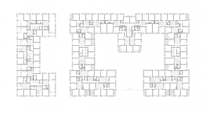 EIN BAUFELD, ZWEI HÄUSER Zwei komplementäre, raumhaltige Baukörper besetzten das lange Rechteck des Baufeldes B 2.1. Sie bedienen unterschiedliche Zielgruppen. Ein kompaktes Haus für die „Best Ager“ profitiert am westlichen Ende des Baufeldes von zwei Aussichtsseiten zum Park. Ein grösseres Haus mit Familienwohnungen umschliesst einen dreiteiligen, gemeinschaftlichen Hofraum, der sich im Süden zum Riedpark öffnet und damit allen Wohnungen Blickbeziehungen ins Grüne eröffnet. Die Gasse zwischen den beiden Häusern erweitert sich zu einem kleinen Platz, der eine selbstverständliche Adresse für Hauseingänge und Ateliers bildet. Analog dazu interpretieren wir auch die Gasse zum Baufeld B2.2 nicht als Abstandhalter, sondern als spezifisch gestalteten, intimen Stadtraum. Die Adressierung von der Brandstrasse und von den Gassen her erlaubt die Formulierung einer klaren Kante zum öffentlichen Park, der nicht durch private Zugänge und Aussenräume beansprucht wird. Grosszügige Eingangshallen vermitteln zwischen den Gassen und dem leicht angehobenen Hofraum und ermöglichen eine dichte Vernetzung der verschiedenen, gemeinschaftlichen und öffentlichen Aussenräume.
