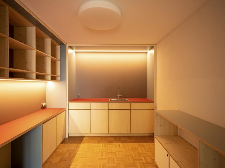 Werden Kinder dazu aufgefordert ein Haus zu zeichnen, hat es oft ein schräges Dach, Fenster mit Sprossen und eine Türe als Eingang. Das bestehende Schulhaus Schwärze aus dem Jahre 1987 transportiert dieses Bild umgeben von einem grossen Garten zum Spielen. Das neue Kindergartenzentrum nutzt die ortsspezifische Qualität und führt diese in ein eigenständiges architektonisches Konzept mit drei Kindergärten inmitten eines Wohnquartiers. In der neu gestalteten Umgebung entstehen unterschiedlich definierte Zonen für die jeweiligen Kindergärten. Die neuen Grundrisse basieren auf der bestehenden dreigeschossigen Schulhaustypologie. Mit der Erfindung eines Garderobenmöbels und einer räumlichen Zusammenfassung zweier Schulzimmer werden geschossweise einfach zonierte Kindergärten organisiert. Die allseitige Belichtung macht den Tageslichtverlauf erlebbar und lässt den Blick frei in die neugestaltete Umgebung. Im Dachgeschoss finden ergänzend ein abtrennbarer Raum für den Mittagstisch und eine Aula ihren Platz. Die teilweise herausfordernde aber robuste Materialisierung wurde in ihren Grundzügen übernommen und in ein neues zeitgemässes Gestaltungskonzept eingebunden. Die damit geschaffene freundliche Raumstimmung basiert auf der Komposition natürlicher Oberflächen in Verbindung mit einer darauf abgestimmten Farbigkeit. Der Lift wird zum raumbildenden Bestandteil des neuen Erschliessungskonzepts und ist gegen Aussen als Element in die neue Dachgaube integriert.