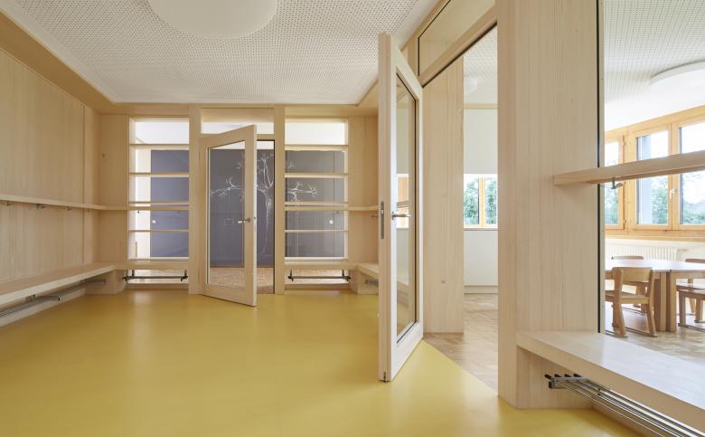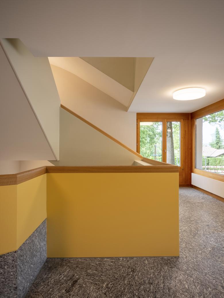 Ursprünglich war das Schulhaus geschossweise mit je zwei Klassenzimmern organisiert. Das Treppenhaus mit der Korridorsituation und den Garderoben bildete die räumliche Erschliessung. Durch die Setzung des zentralen Lifts und der Verknüpfung zweier Klassenräume werden anstelle der ursprünglichen Korridorsituation neue Raumqualitäten als Begegnungsraum für die Kindergärten geschaffen. Der neu definierte vertikale Treppenraum mit den ausgeschnittenen Lichthöfen ist das verbindende Element zum Aussenraum.