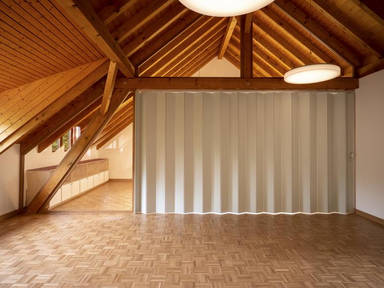 Durch die untergeordneten Fassadeneingriffe im bestehenden 2-Schalenmauerwerk konnten die Holzmetallfenster und Rafflamellenstoren nach einer Analyse übernommen werden. Die Fassadenerweiterung im Sockelgeschoss verbindet nun den neuen Kindergarten über eine Landschaftsmulde mit dem Aussenraum. Dies ist auch im Sinne eines bedachten Umgangs mit dem am Bau bereits vorhandenen Resourcen. Sämtliche Dachflächen und Kellerdecken wurden energetisch saniert und mit einer Photovoltaikanlage ergänzt. Die elektrischen Installationen wurden mittels einer sternförmigen Verlegung automatisiert und mit einer Storen- und Lichtsteuerung ergänzt.