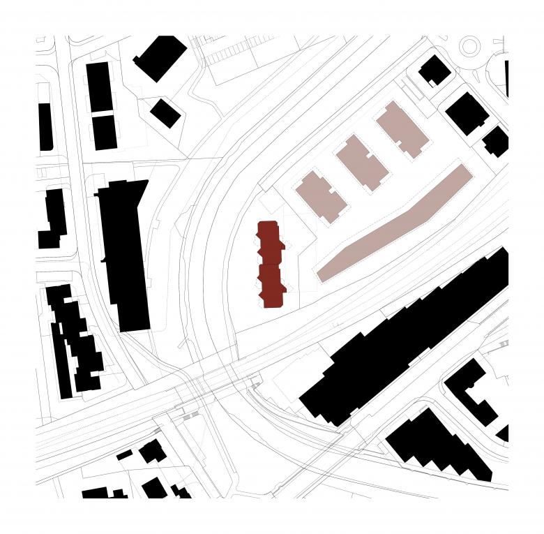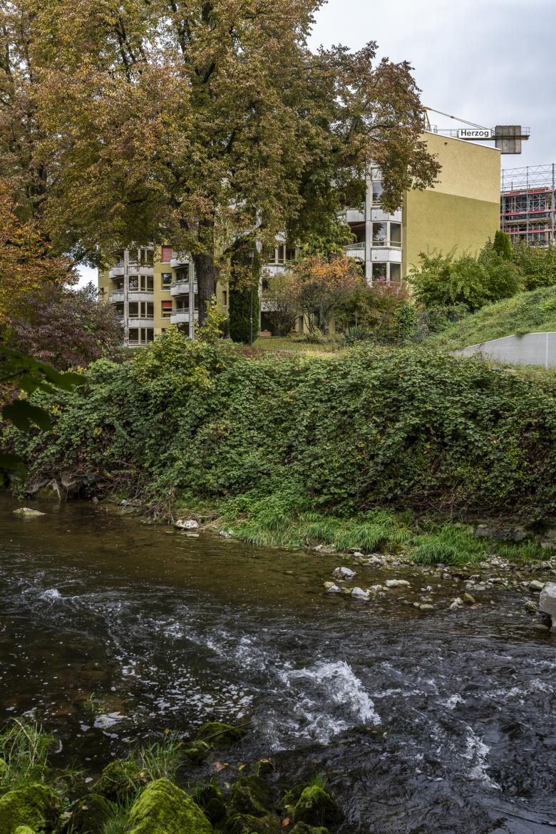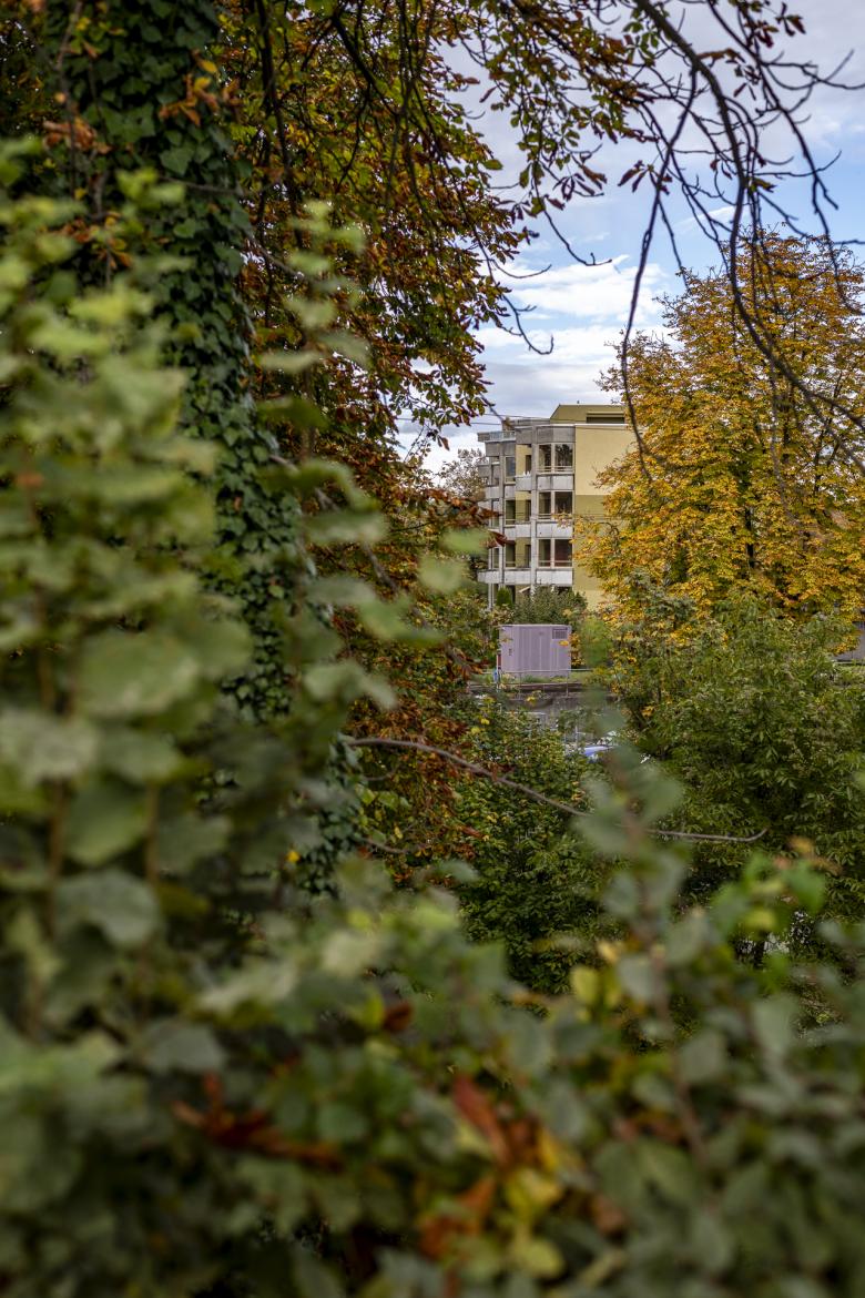 Das fünfgeschossige Wohngebäude mit 22 Mietwohnungen aus dem Jahr 1984 steht an zentraler Lage am Murgufer in Frauenfeld. 2023 findet sich der einst am Rande stehende schlichte und graue Mietwohnungsblock nun plötzlich als integraler Bestandteil einer lebendigen urbanen Umgebung wieder. Entsprechend kleidet sich das Gebäude neu. Die analog eines Bastelbogens in die Fläche gelegte Fassadenabwicklung wird mit einem sich wiederholenden und bewusst in Grüntönen gehaltenen farbigen Fries bespielt. Zusammen mit den polygonalen Vor- und Rücksprüngen entwickeln sich neue spannende Farbräume für die Mieter*innen. Der Baukörper gliedert sich neu und fordert eine neue Lesbarkeit und Identität. Zusammen mit der Farbe Grün wird das Gebäude in Zukunft den Abschluss der zukünftig in Beton- und Holz gehaltenen benachbarten Stadtsiedlung von Diagonal Architekten aus Winterthur bilden. Je nach der Jahreszeit bindet sich das Konzept in die Umgebung ein oder bleibt im Winter grün.