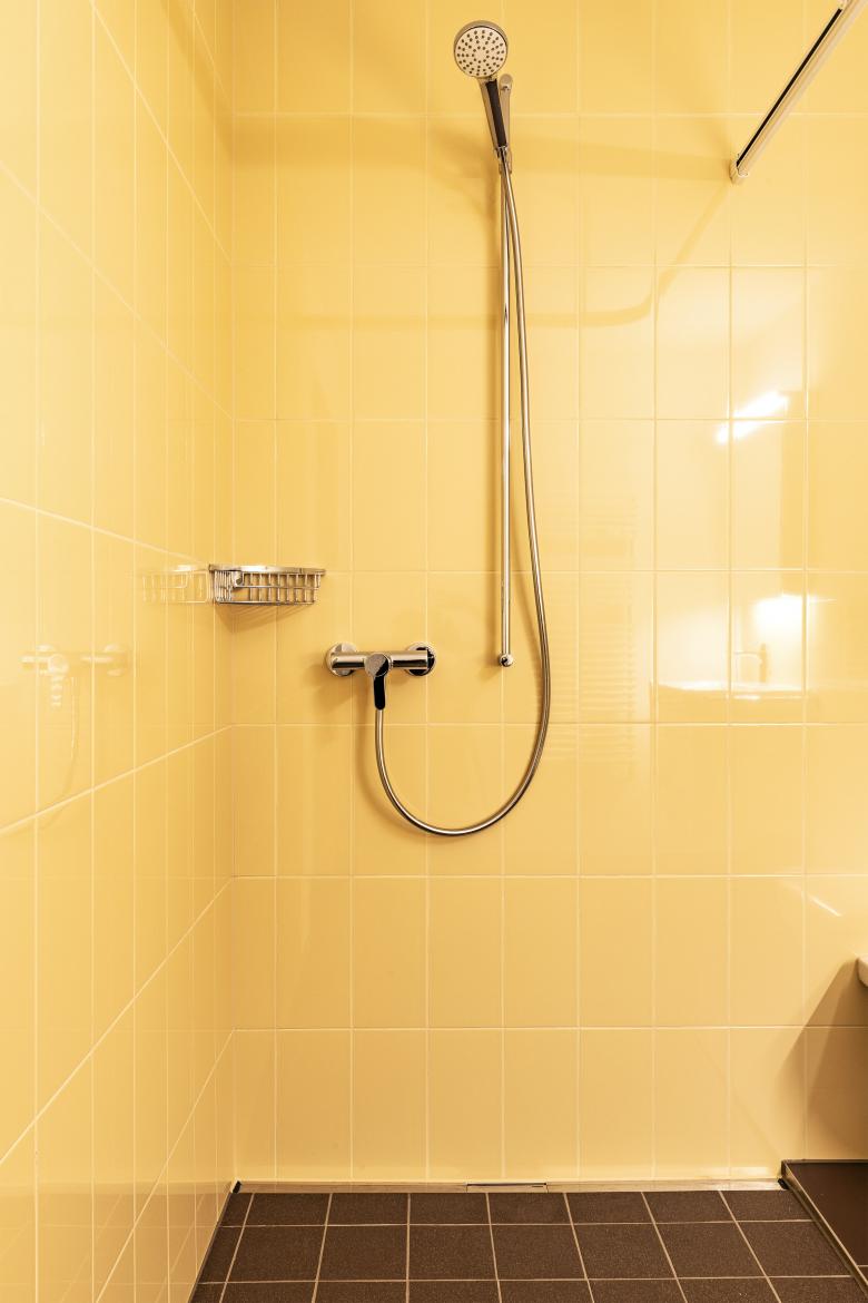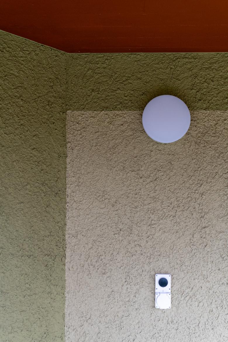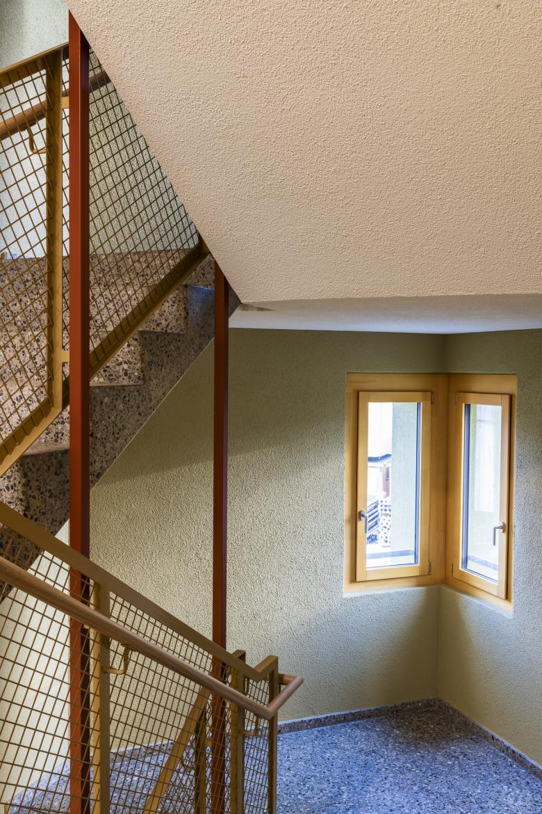 Der Entwurf beschränkt sich auch wenige Grundrisskorrekturen und befasst sich mit einer atmosphärischen und funktionalen Weiterentwicklung der bestehenden Architektursprache. Die bestehende Grundrissabwicklung mit den polygonalen Rück- und Vorsprüngen entwickelt ein spannendes Thema der Verzahnung mit der Umgebung. Gegen Aussen wurden einzig die zu kleinen Eingänge mit einem neuen ausladenden Eingangsbereich bespielt. Die Grundrissgrössen und Typologien konnten mit einfachen Eingriffen in die heutige Zeit geführt werden. Die rationale und robuste Materialisierungen der Innenräume wurden übernommen und mit dem atmosphärischen Element Farbe ergänzt.