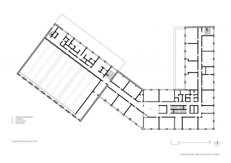 Der von der Straßenkreuzung hinter das Biotop zurückgesetzte Hochpunkt der Schule formuliert ein städtebauliches Zeichen und schafft einen neuen Orientierungspunkt im Stadtraum. Der Schulbaukörper orientiert sich vorrangig entlang der Prager Straße und bildet hier eine schützende und stadtraumfassende Raumkante zu der stark frequentierten Verkehrsachse Prager Straße. Die gestapelten Sporthallen entlang der Philipp-Rosenthal-Straße werden über einen zurückgesetzten Brückenkörper mit der Schule verbunden. Gebäudesetzung und Schulvorplatz bilden die Adresse der Bildungseinrichtung, während die Schul- und Sportfreiflächen im geschützten rückwärtigen Bereich angeordnet sind.